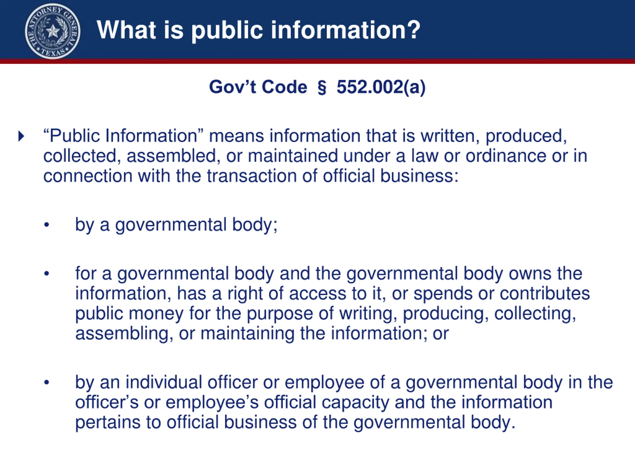 What is public information? 552.002(a) Gov t Code Public Information means information that is written, produced, collected, assembled, or maintained under a law or ordinance or in connection with the transaction of official business: by a governmental body; for a governmental body and the governmental body owns the information, has a right of access to it, or spends or contributes public money for the purpose of writing, producing, collecting, assembling, or maintaining the information; or by an individual officer or employee of a governmental body in the officer s or employee s official capacity and the information pertains to official business of the governmental body.