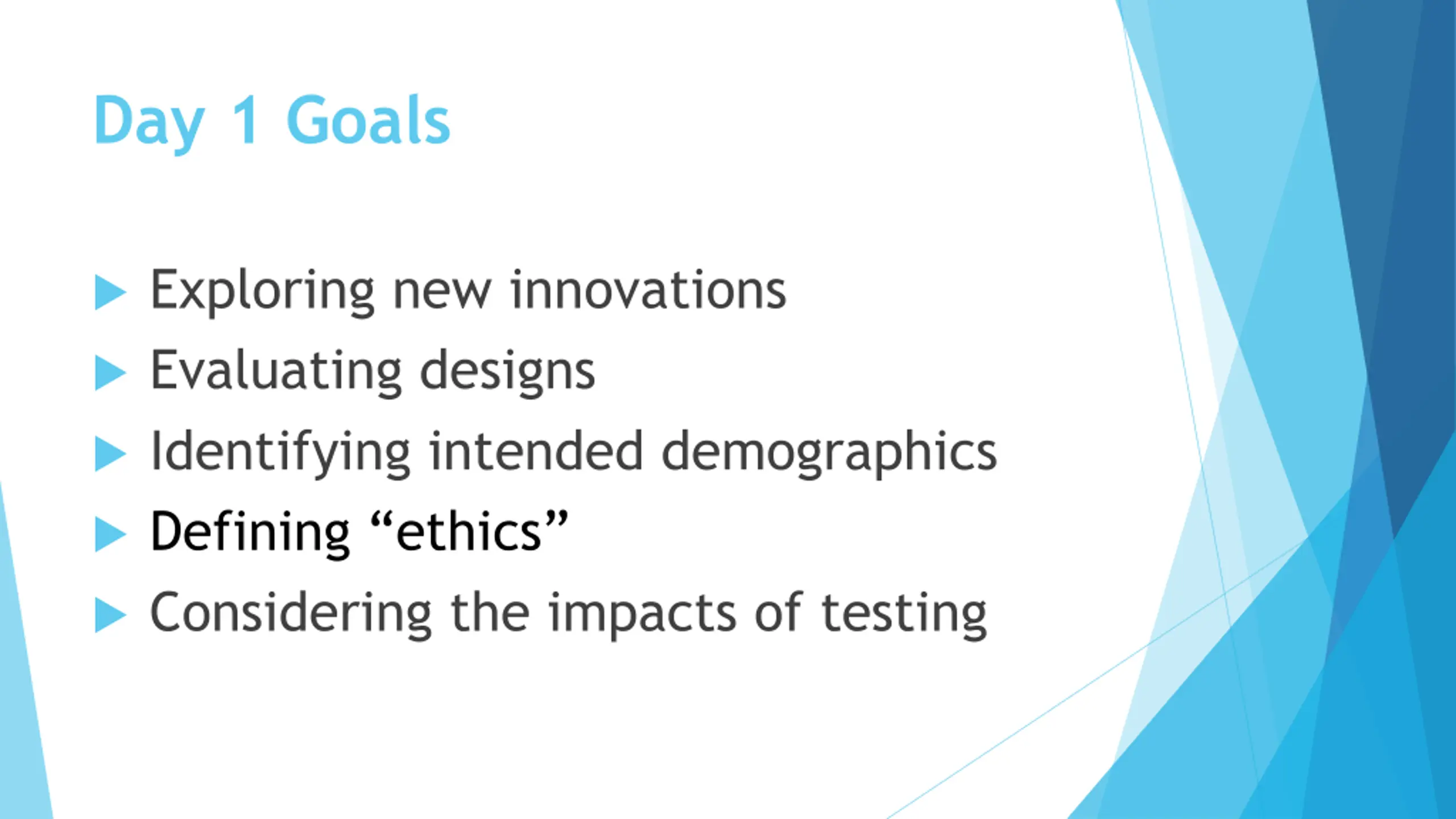 Day 1 Goals Exploring new innovations Evaluating designs Identifying intended demographics Defining ethics Considering the impacts of testing