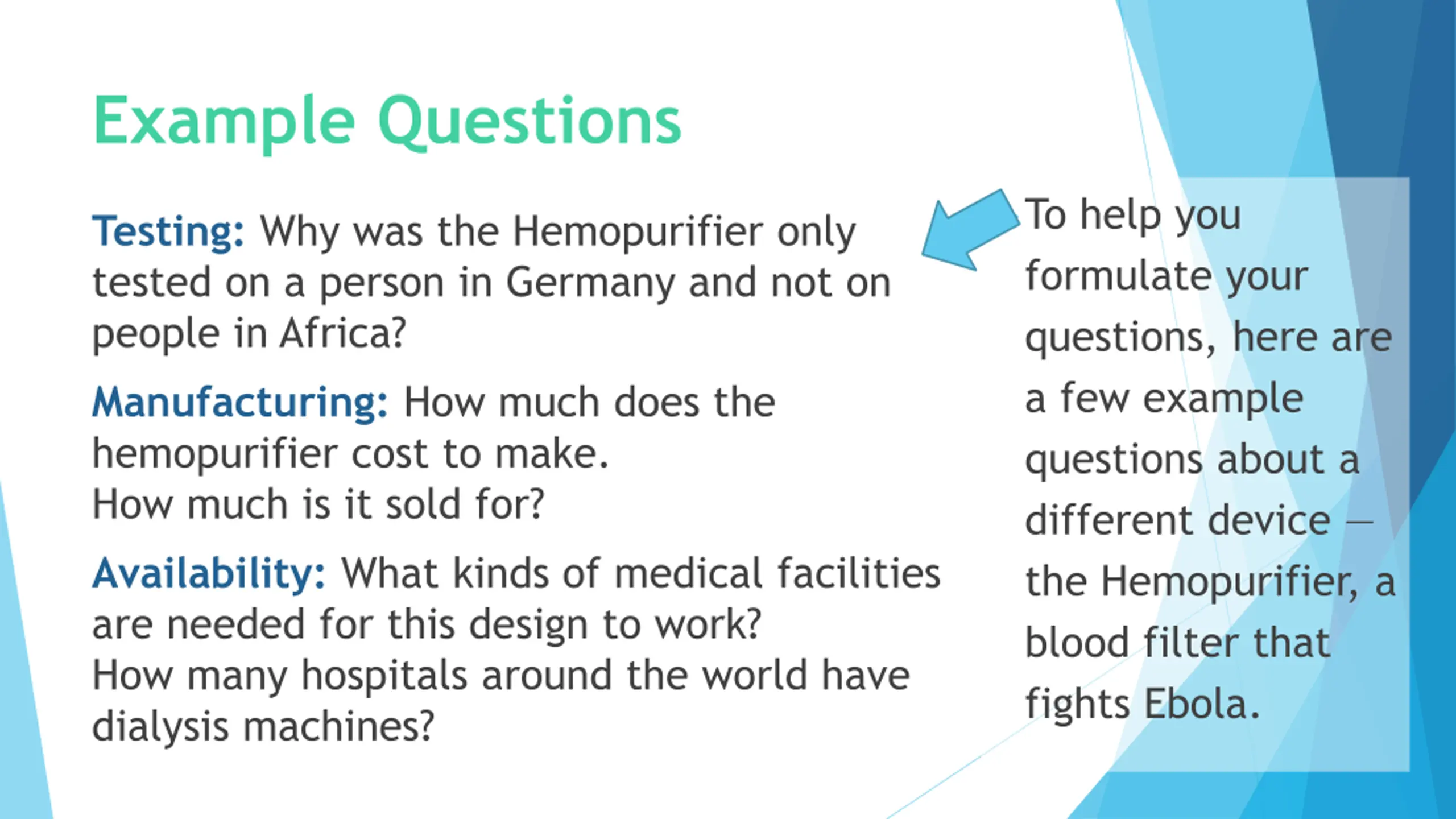 Example Questions To help you formulate your questions, here are a few example questions about a different device the Hemopurifier, a blood filter that fights Ebola. Testing: Why was the Hemopurifier only tested on a person in Germany and not on people in Africa? Manufacturing: How much does the hemopurifier cost to make. How much is it sold for? Availability: What kinds of medical facilities are needed for this design to work? How many hospitals around the world have dialysis machines?