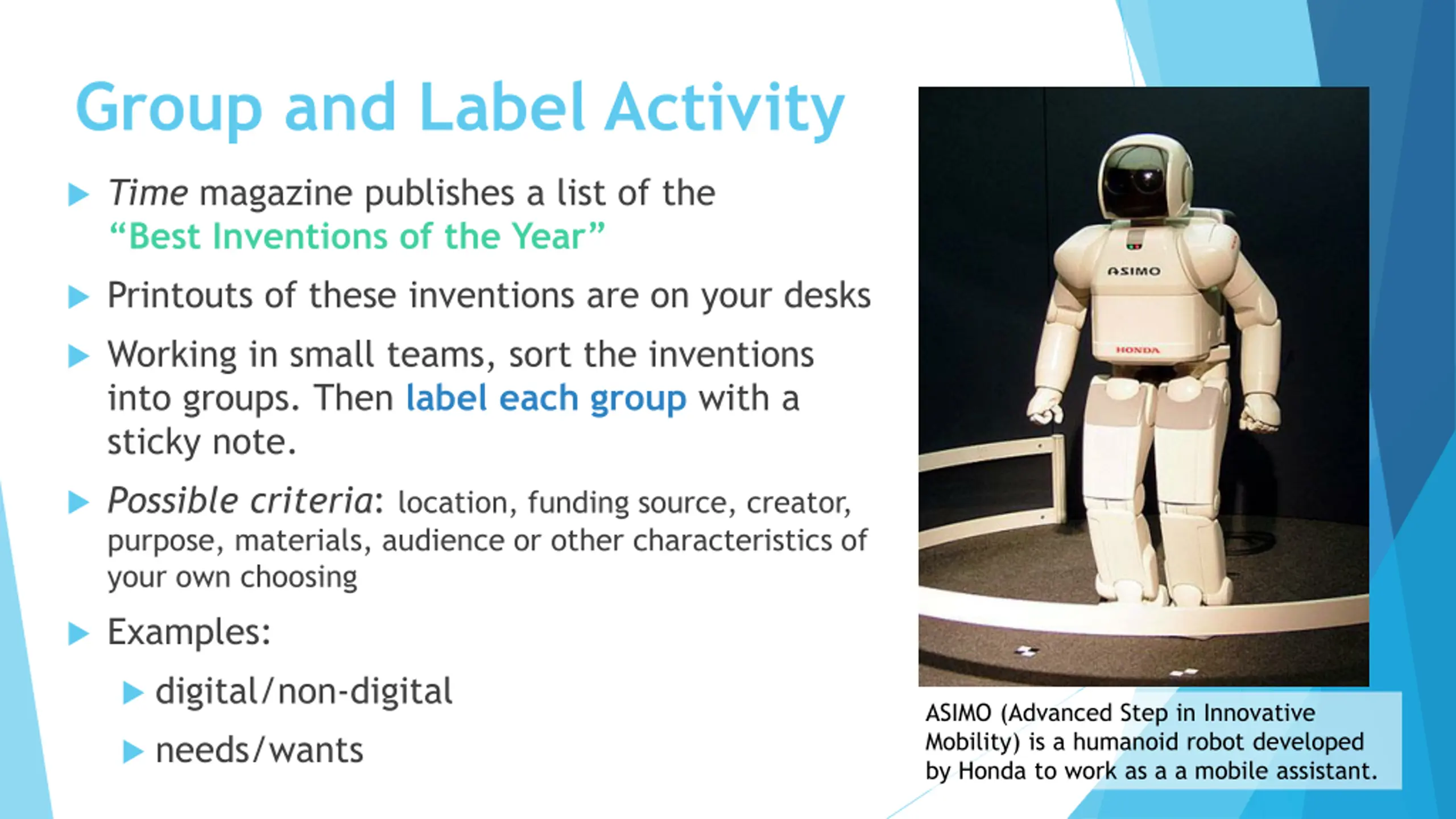 Group and Label Activity Time magazine publishes a list of the Best Inventions of the Year Printouts of these inventions are on your desks Working in small teams, sort the inventions into groups. Then label each group with a sticky note. Possible criteria: location, funding source, creator, purpose, materials, audience or other characteristics of your own choosing Examples: digital/non-digital ASIMO (Advanced Step in Innovative Mobility) is a humanoid robot developed by Honda to work as a a mobile assistant. needs/wants