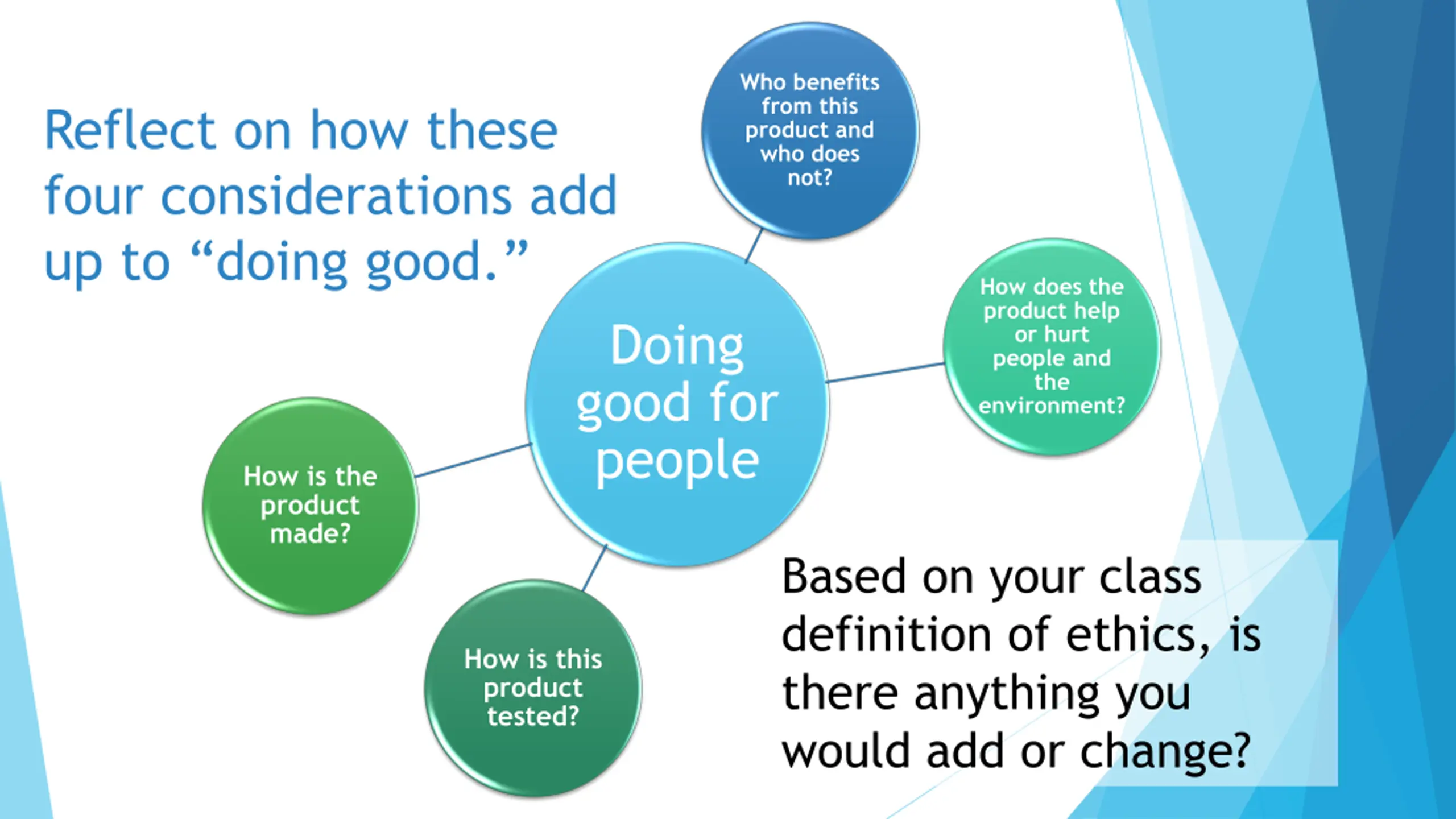Who benefits from this product and who does not? Reflect on how these four considerations add up to doing good. How does the product help or hurt people and the environment? Doing good for people How is the product made? Based on your class definition of ethics, is there anything you would add or change? How is this product tested?