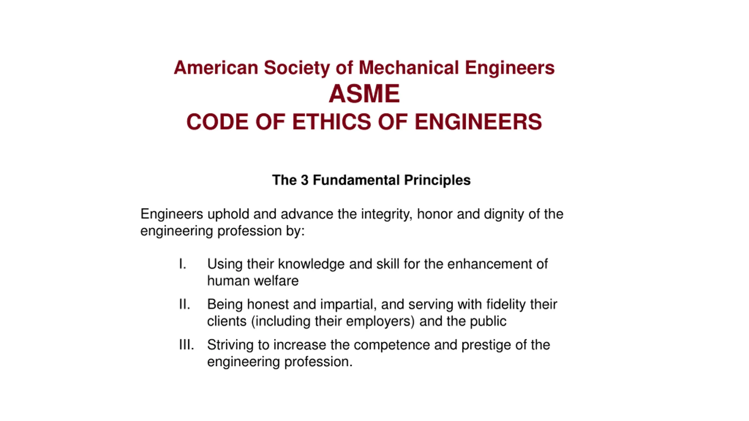 American Society of Mechanical Engineers ASME CODE OF ETHICS OF ENGINEERS The 3 Fundamental Principles Engineers uphold and advance the integrity, honor and dignity of the engineering profession by: I. Using their knowledge and skill for the enhancement of human welfare II. Being honest and impartial, and serving with fidelity their clients (including their employers) and the public III. Striving to increase the competence and prestige of the engineering profession.