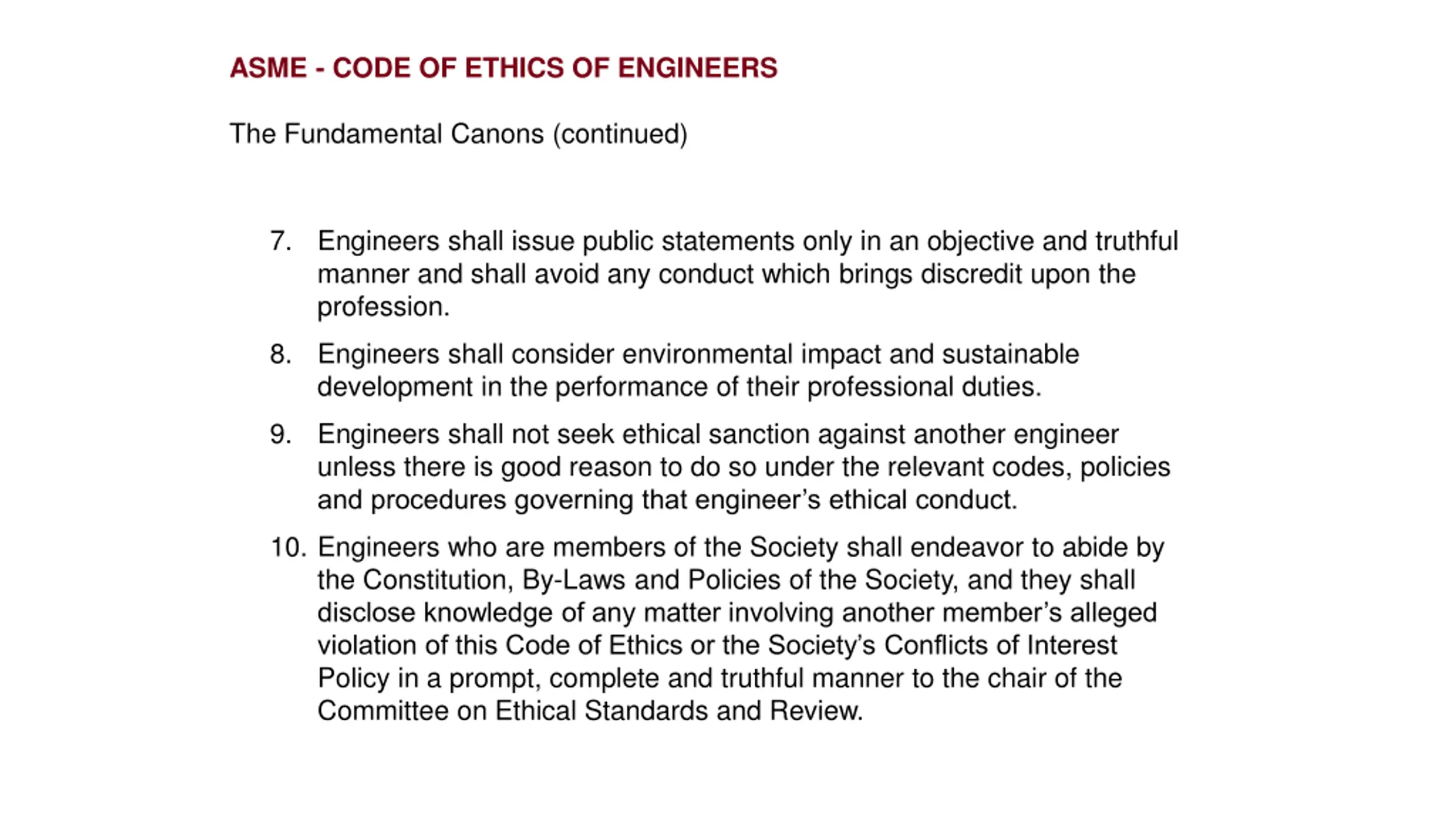ASME - CODE OF ETHICS OF ENGINEERS The Fundamental Canons (continued) 7. Engineers shall issue public statements only in an objective and truthful manner and shall avoid any conduct which brings discredit upon the profession. 8. Engineers shall consider environmental impact and sustainable development in the performance of their professional duties. 9. Engineers shall not seek ethical sanction against another engineer unless there is good reason to do so under the relevant codes, policies and procedures governing that engineer s ethical conduct. 10. Engineers who are members of the Society shall endeavor to abide by the Constitution, By-Laws and Policies of the Society, and they shall disclose knowledge of any matter involving another member s alleged violation of this Code of Ethics or the Society s Conflicts of Interest Policy in a prompt, complete and truthful manner to the chair of the Committee on Ethical Standards and Review.