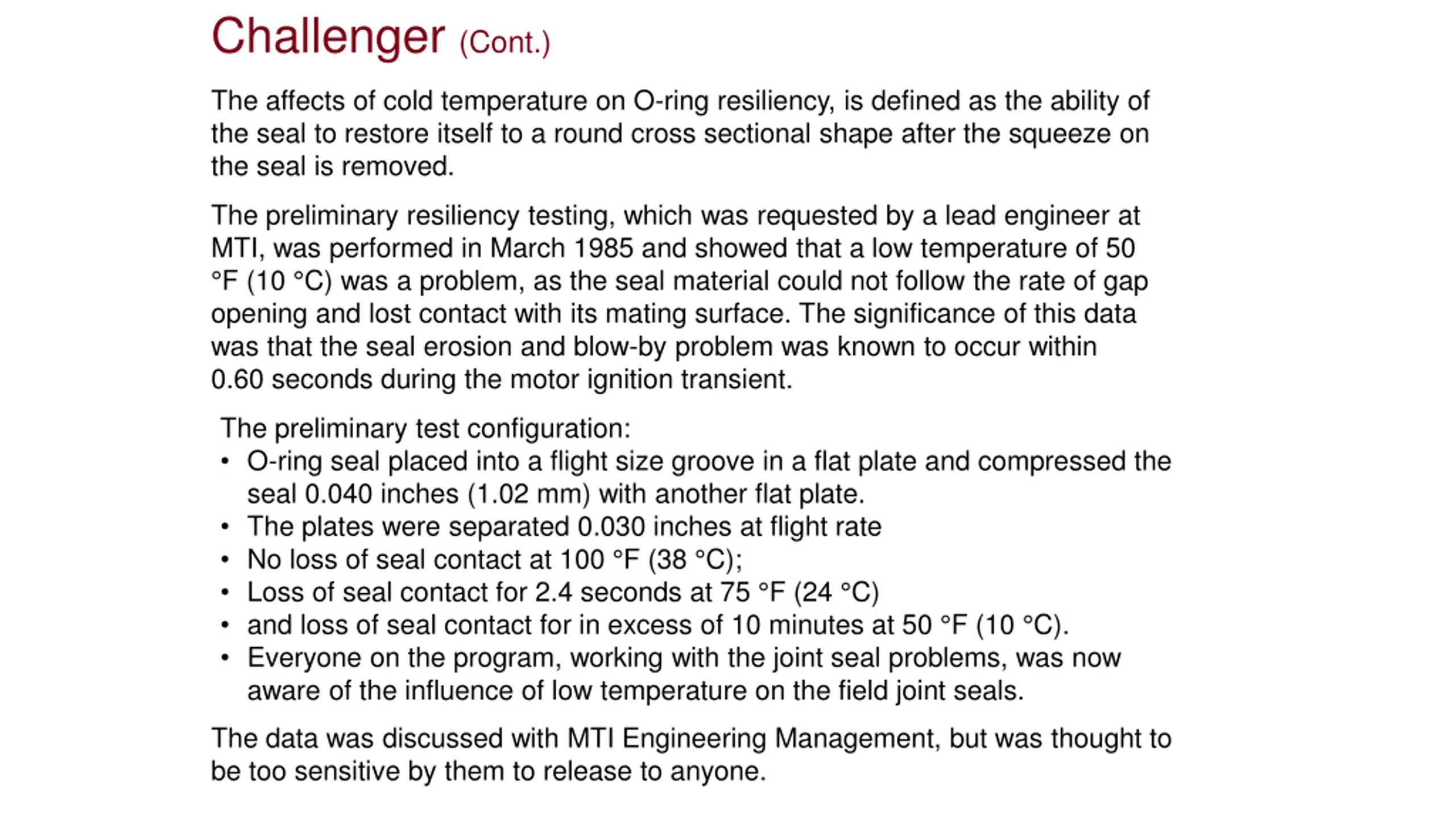 Challenger (Cont.) The affects of cold temperature on O-ring resiliency, is defined as the ability of the seal to restore itself to a round cross sectional shape after the squeeze on the seal is removed. The preliminary resiliency testing, which was requested by a lead engineer at MTI, was performed in March 1985 and showed that a low temperature of 50 F (10 C) was a problem, as the seal material could not follow the rate of gap opening and lost contact with its mating surface. The significance of this data was that the seal erosion and blow-by problem was known to occur within 0.60 seconds during the motor ignition transient. The preliminary test configuration: O-ring seal placed into a flight size groove in a flat plate and compressed the seal 0.040 inches (1.02 mm) with another flat plate. The plates were separated 0.030 inches at flight rate No loss of seal contact at 100 F (38 C); Loss of seal contact for 2.4 seconds at 75 F (24 C) and loss of seal contact for in excess of 10 minutes at 50 F (10 C). Everyone on the program, working with the joint seal problems, was now aware of the influence of low temperature on the field joint seals. The data was discussed with MTI Engineering Management, but was thought to be too sensitive by them to release to anyone.