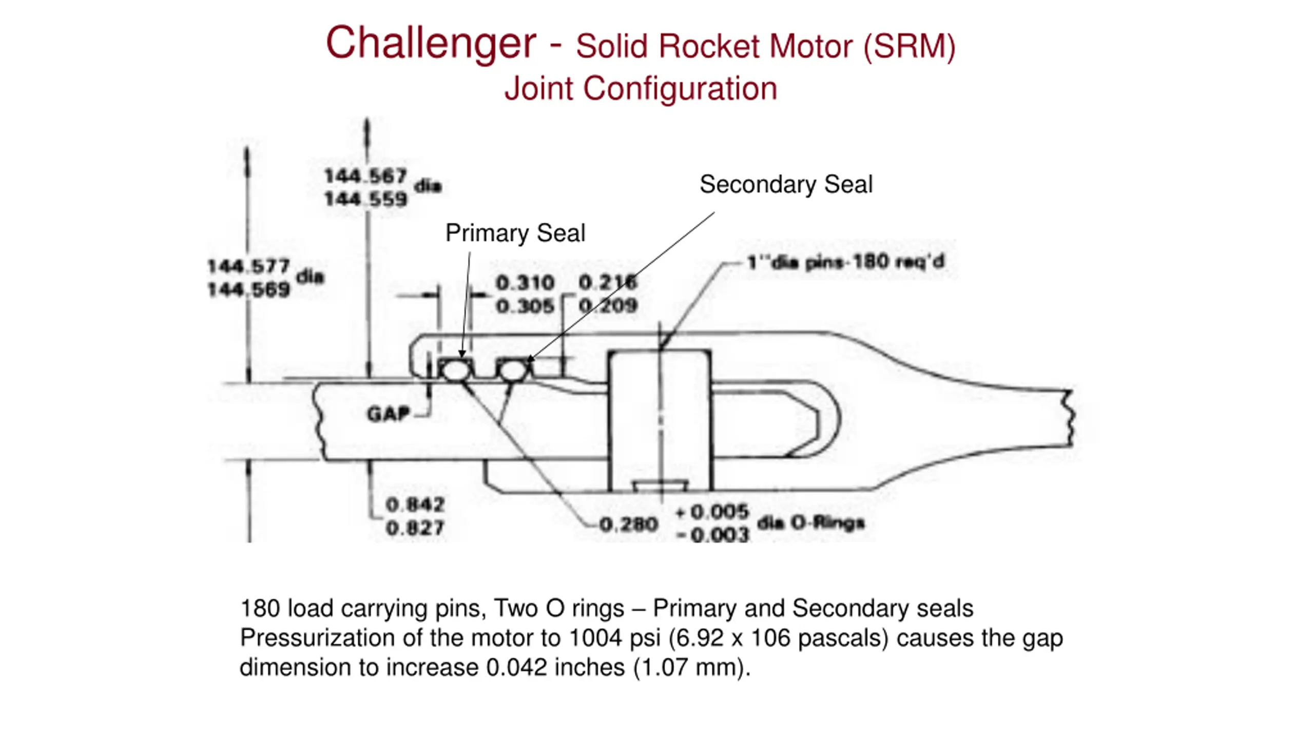 Challenger - Solid Rocket Motor (SRM) Joint Configuration Secondary Seal Primary Seal 180 load carrying pins, Two O rings Primary and Secondary seals Pressurization of the motor to 1004 psi (6.92 x 106 pascals) causes the gap dimension to increase 0.042 inches (1.07 mm).