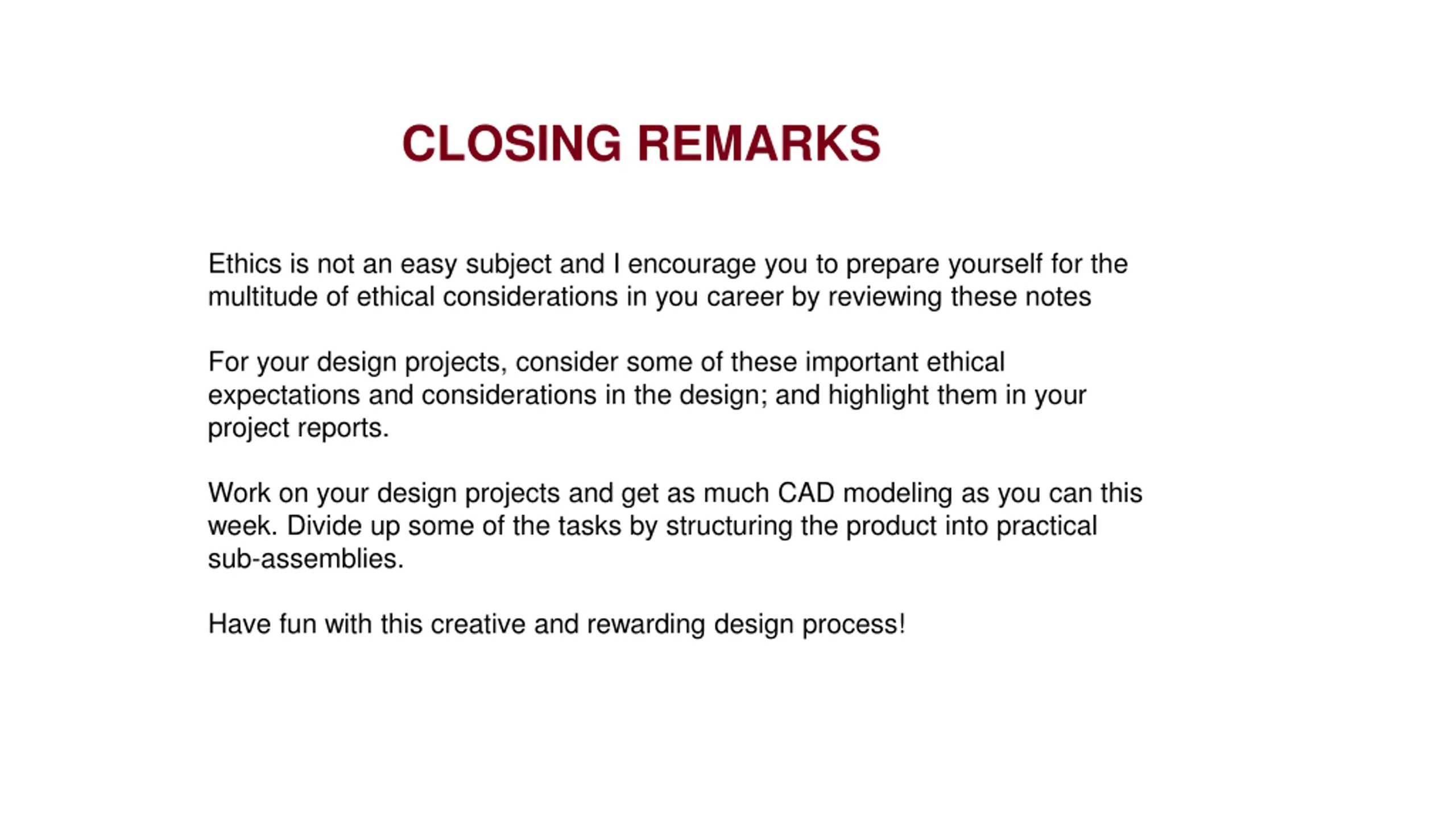 CLOSING REMARKS Ethics is not an easy subject and I encourage you to prepare yourself for the multitude of ethical considerations in you career by reviewing these notes For your design projects, consider some of these important ethical expectations and considerations in the design; and highlight them in your project reports. Work on your design projects and get as much CAD modeling as you can this week. Divide up some of the tasks by structuring the product into practical sub-assemblies. Have fun with this creative and rewarding design process!