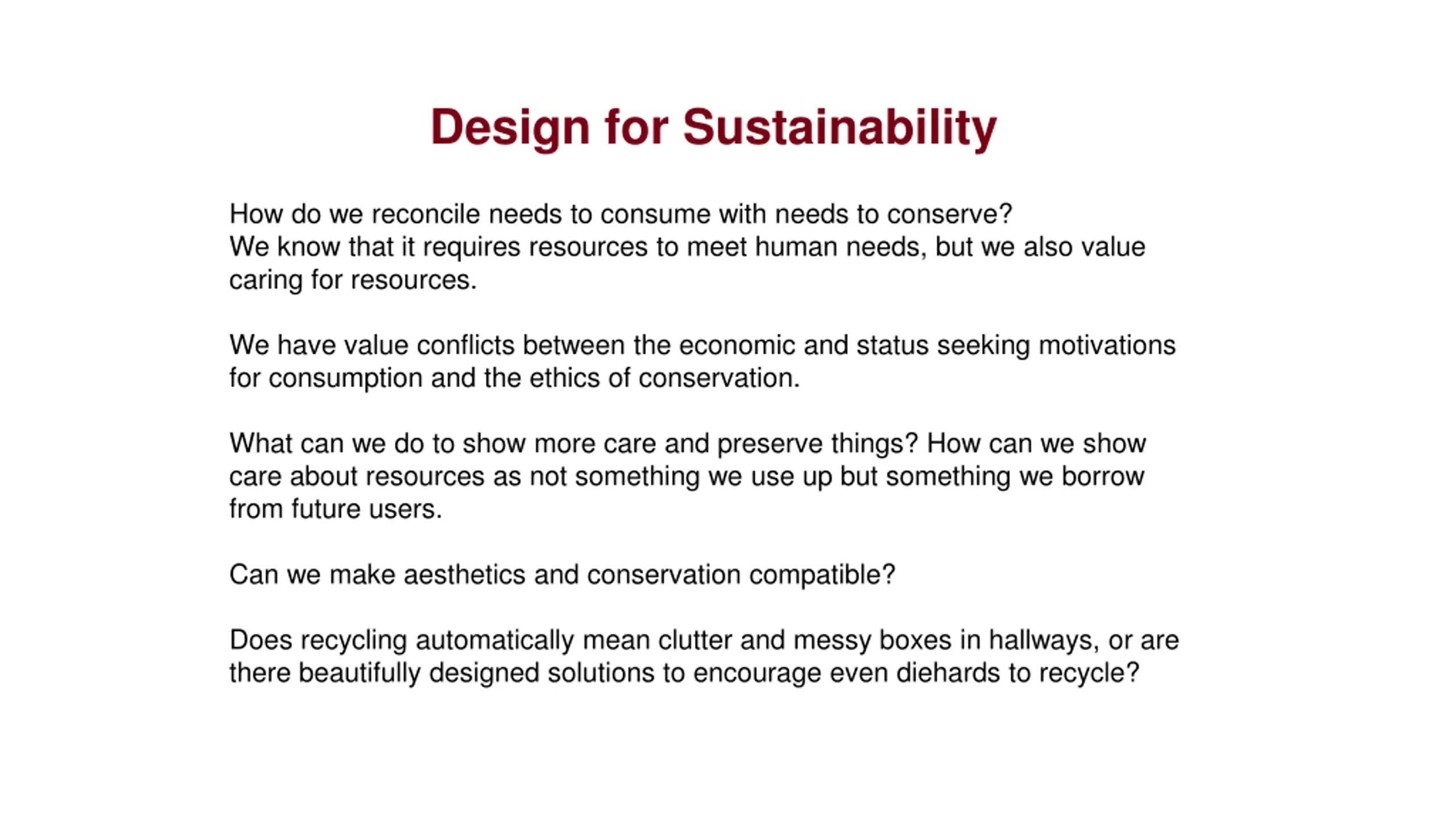 Design for Sustainability How do we reconcile needs to consume with needs to conserve? We know that it requires resources to meet human needs, but we also value caring for resources. We have value conflicts between the economic and status seeking motivations for consumption and the ethics of conservation. What can we do to show more care and preserve things? How can we show care about resources as not something we use up but something we borrow from future users. Can we make aesthetics and conservation compatible? Does recycling automatically mean clutter and messy boxes in hallways, or are there beautifully designed solutions to encourage even diehards to recycle?