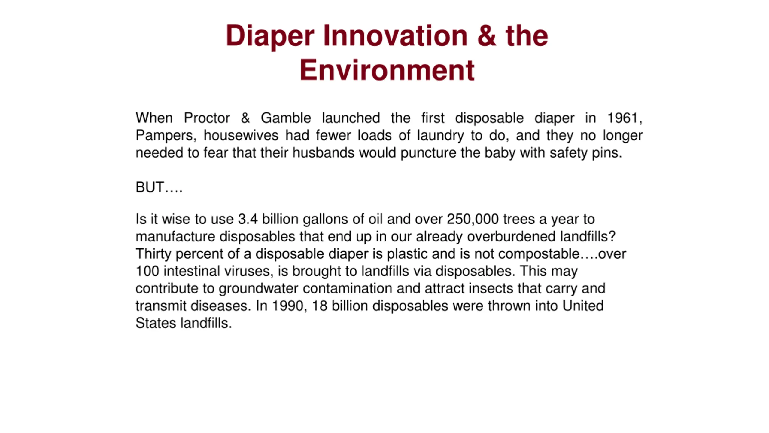 Diaper Innovation & the Environment When Proctor & Gamble launched the first disposable diaper in 1961, Pampers, housewives had fewer loads of laundry to do, and they no longer needed to fear that their husbands would puncture the baby with safety pins. BUT . Is it wise to use 3.4 billion gallons of oil and over 250,000 trees a year to manufacture disposables that end up in our already overburdened landfills? Thirty percent of a disposable diaper is plastic and is not compostable .over 100 intestinal viruses, is brought to landfills via disposables. This may contribute to groundwater contamination and attract insects that carry and transmit diseases. In 1990, 18 billion disposables were thrown into United States landfills.