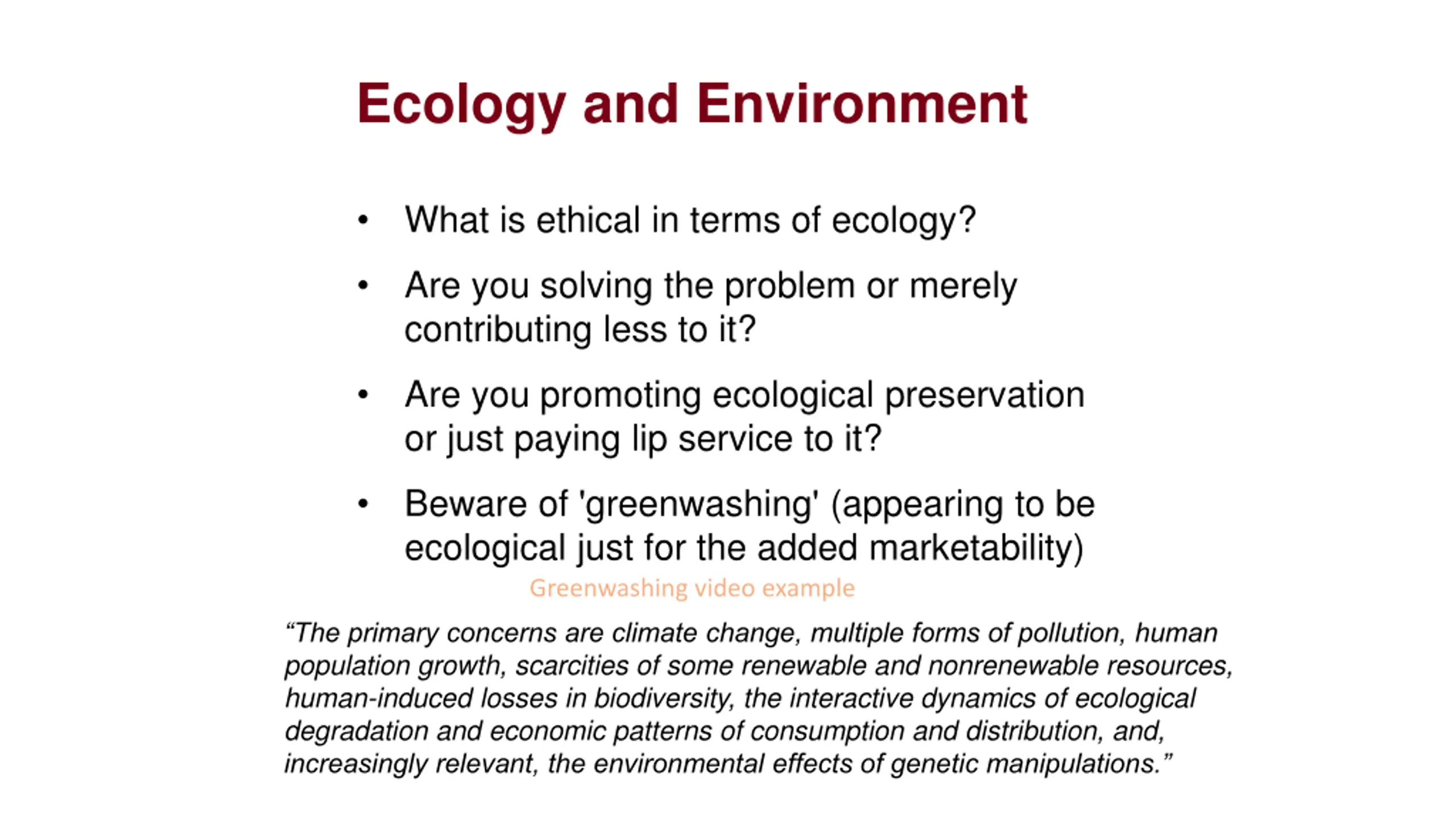 Ecology and Environment What is ethical in terms of ecology? Are you solving the problem or merely contributing less to it? Are you promoting ecological preservation or just paying lip service to it? Beware of 'greenwashing' (appearing to be ecological just for the added marketability) Greenwashing video example Greenwashing video example The primary concerns are climate change, multiple forms of pollution, human population growth, scarcities of some renewable and nonrenewable resources, human-induced losses in biodiversity, the interactive dynamics of ecological degradation and economic patterns of consumption and distribution, and, increasingly relevant, the environmental effects of genetic manipulations.