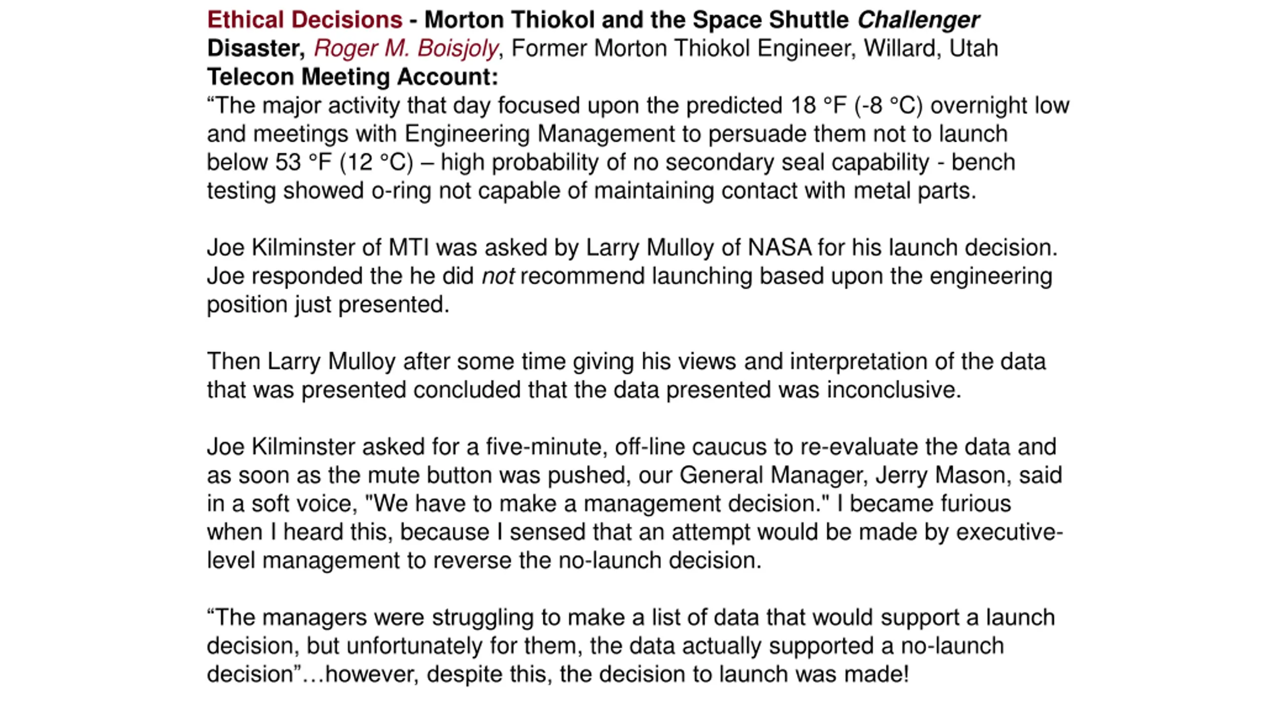 Ethical Decisions - Morton Thiokol and the Space Shuttle Challenger Disaster, Roger M. Boisjoly, Former Morton Thiokol Engineer, Willard, Utah Telecon Meeting Account: The major activity that day focused upon the predicted 18 F (-8 C) overnight low and meetings with Engineering Management to persuade them not to launch below 53 F (12 C) high probability of no secondary seal capability - bench testing showed o-ring not capable of maintaining contact with metal parts. Joe Kilminster of MTI was asked by Larry Mulloy of NASA for his launch decision. Joe responded the he did not recommend launching based upon the engineering position just presented. Then Larry Mulloy after some time giving his views and interpretation of the data that was presented concluded that the data presented was inconclusive. Joe Kilminster asked for a five-minute, off-line caucus to re-evaluate the data and as soon as the mute button was pushed, our General Manager, Jerry Mason, said in a soft voice, "We have to make a management decision." I became furious when I heard this, because I sensed that an attempt would be made by executive- level management to reverse the no-launch decision. The managers were struggling to make a list of data that would support a launch decision, but unfortunately for them, the data actually supported a no-launch decision however, despite this, the decision to launch was made!