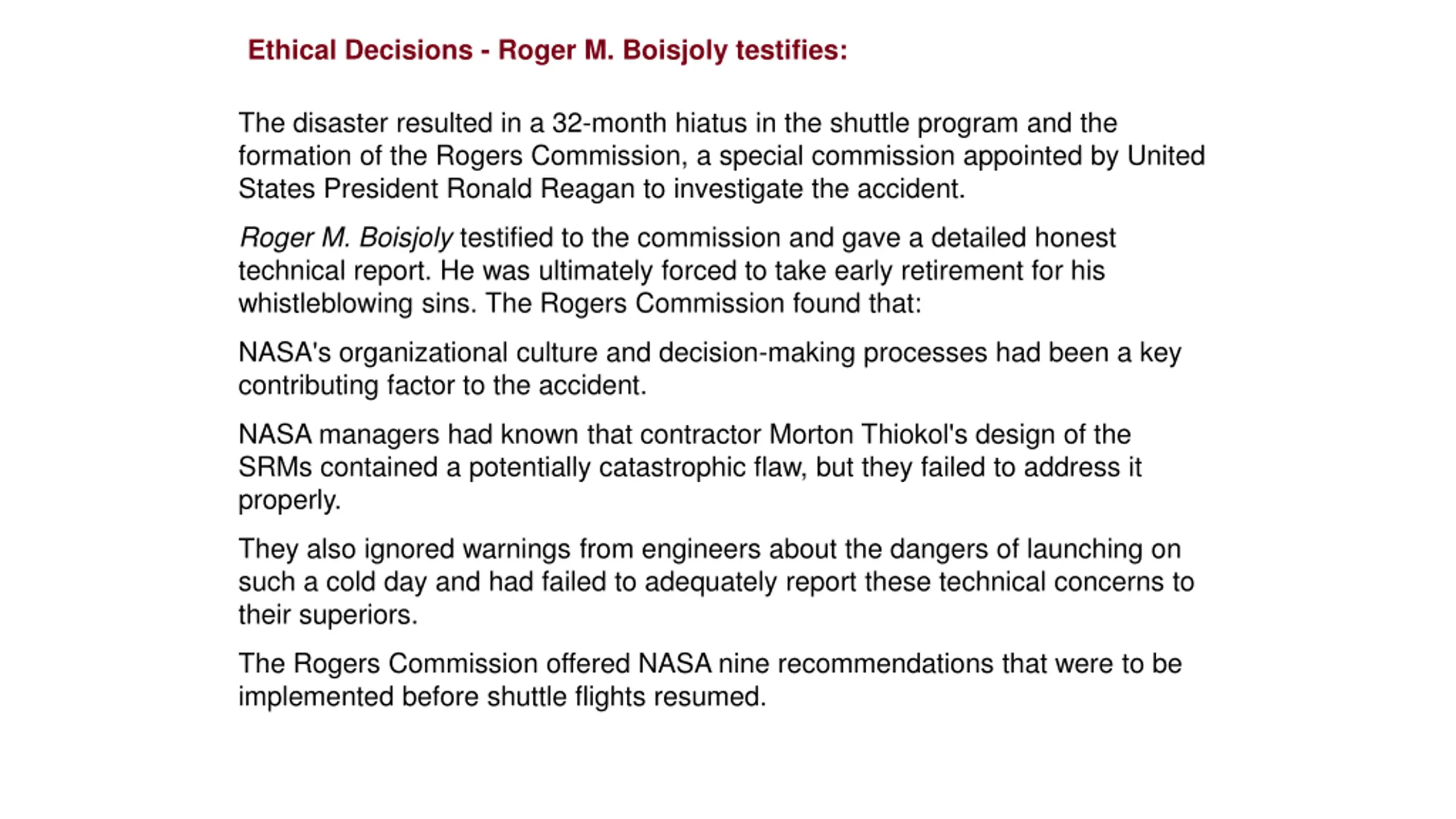 Ethical Decisions - Roger M. Boisjoly testifies: The disaster resulted in a 32-month hiatus in the shuttle program and the formation of the Rogers Commission, a special commission appointed by United States President Ronald Reagan to investigate the accident. Roger M. Boisjoly testified to the commission and gave a detailed honest technical report. He was ultimately forced to take early retirement for his whistleblowing sins. The Rogers Commission found that: NASA's organizational culture and decision-making processes had been a key contributing factor to the accident. NASA managers had known that contractor Morton Thiokol's design of the SRMs contained a potentially catastrophic flaw, but they failed to address it properly. They also ignored warnings from engineers about the dangers of launching on such a cold day and had failed to adequately report these technical concerns to their superiors. The Rogers Commission offered NASA nine recommendations that were to be implemented before shuttle flights resumed.