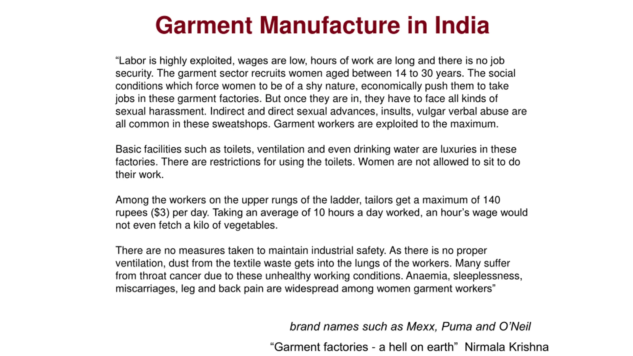Garment Manufacture in India Labor is highly exploited, wages are low, hours of work are long and there is no job security. The garment sector recruits women aged between 14 to 30 years. The social conditions which force women to be of a shy nature, economically push them to take jobs in these garment factories. But once they are in, they have to face all kinds of sexual harassment. Indirect and direct sexual advances, insults, vulgar verbal abuse are all common in these sweatshops. Garment workers are exploited to the maximum. Basic facilities such as toilets, ventilation and even drinking water are luxuries in these factories. There are restrictions for using the toilets. Women are not allowed to sit to do their work. Among the workers on the upper rungs of the ladder, tailors get a maximum of 140 rupees ($3) per day. Taking an average of 10 hours a day worked, an hour s wage would not even fetch a kilo of vegetables. There are no measures taken to maintain industrial safety. As there is no proper ventilation, dust from the textile waste gets into the lungs of the workers. Many suffer from throat cancer due to these unhealthy working conditions. Anaemia, sleeplessness, miscarriages, leg and back pain are widespread among women garment workers brand names such as Mexx, Puma and O Neil Garment factories - a hell on earth Nirmala Krishna