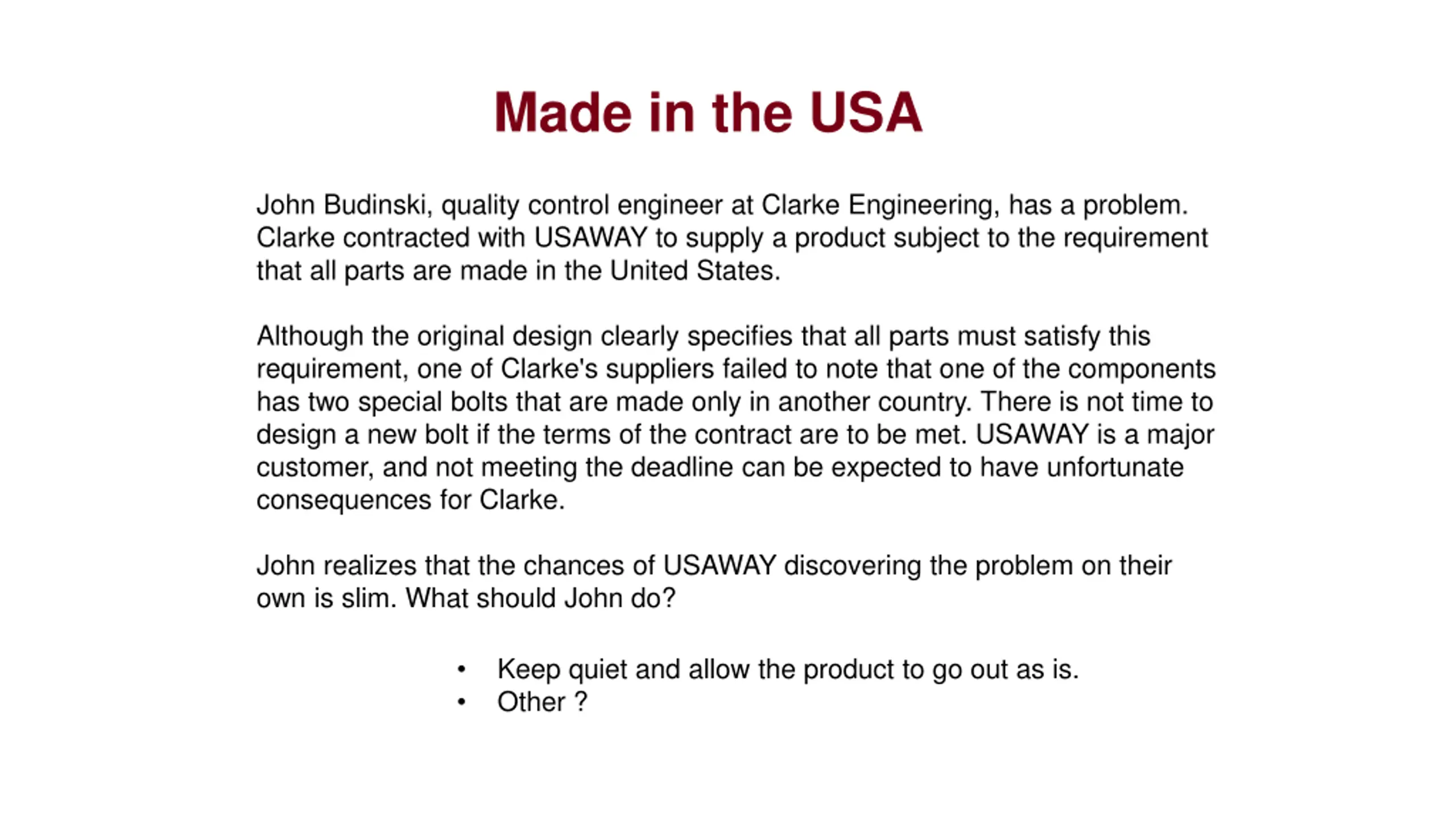 Made in the USA John Budinski, quality control engineer at Clarke Engineering, has a problem. Clarke contracted with USAWAY to supply a product subject to the requirement that all parts are made in the United States. Although the original design clearly specifies that all parts must satisfy this requirement, one of Clarke's suppliers failed to note that one of the components has two special bolts that are made only in another country. There is not time to design a new bolt if the terms of the contract are to be met. USAWAY is a major customer, and not meeting the deadline can be expected to have unfortunate consequences for Clarke. John realizes that the chances of USAWAY discovering the problem on their own is slim. What should John do? Keep quiet and allow the product to go out as is. Other ?