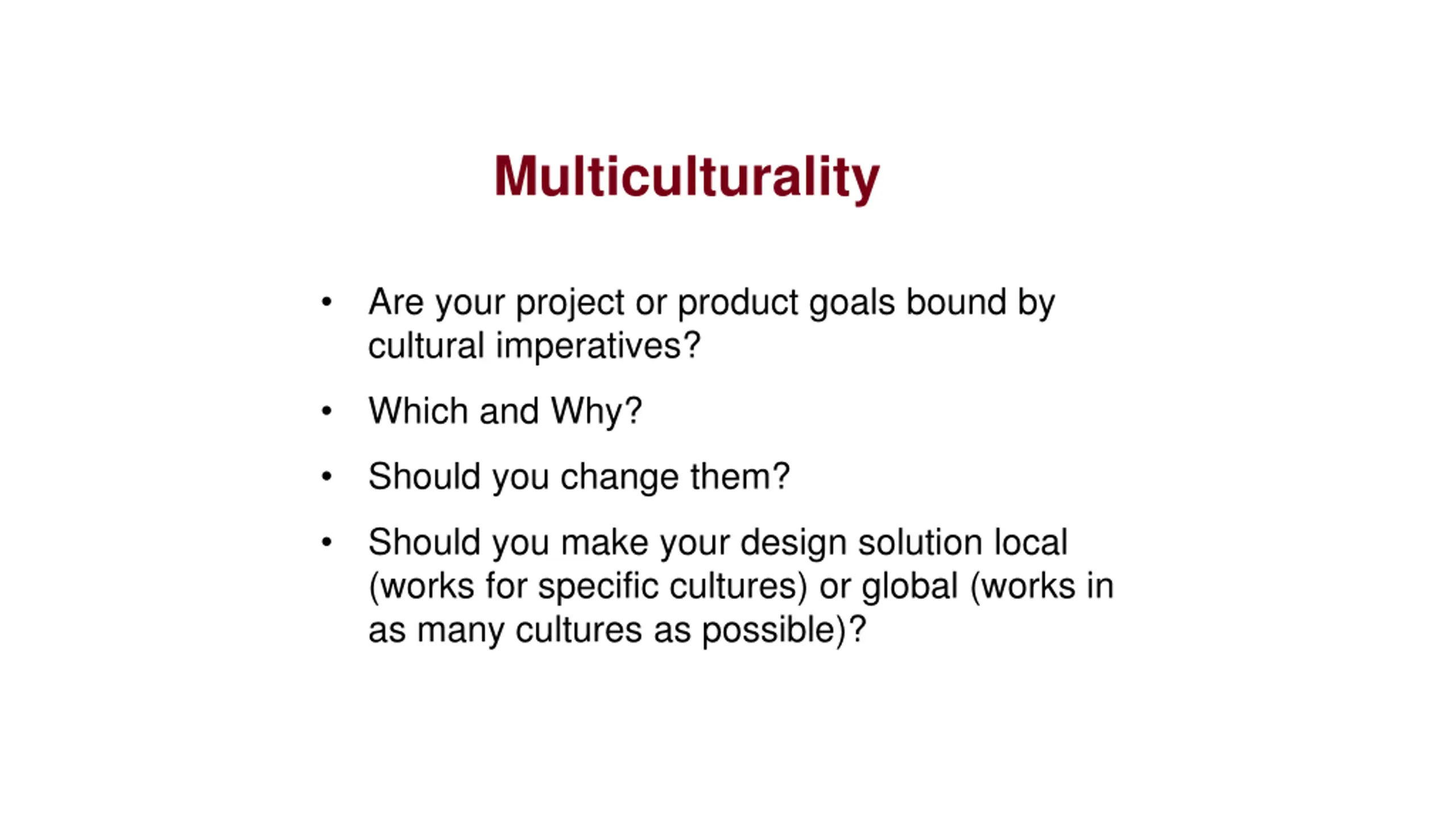 Multiculturality Are your project or product goals bound by cultural imperatives? Which and Why? Should you change them? Should you make your design solution local (works for specific cultures) or global (works in as many cultures as possible)?