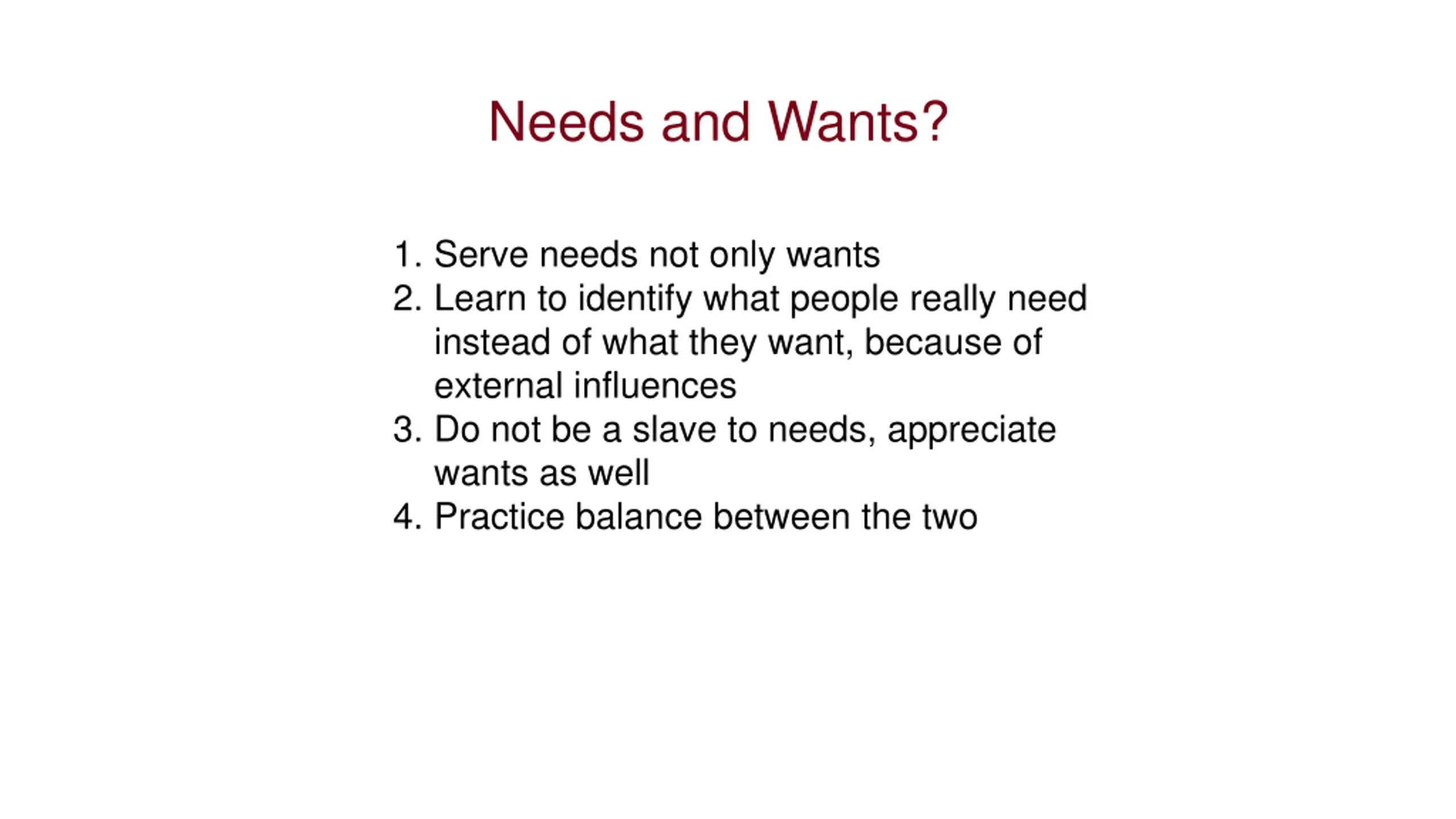 Needs and Wants? 1. Serve needs not only wants 2. Learn to identify what people really need instead of what they want, because of external influences 3. Do not be a slave to needs, appreciate wants as well 4. Practice balance between the two
