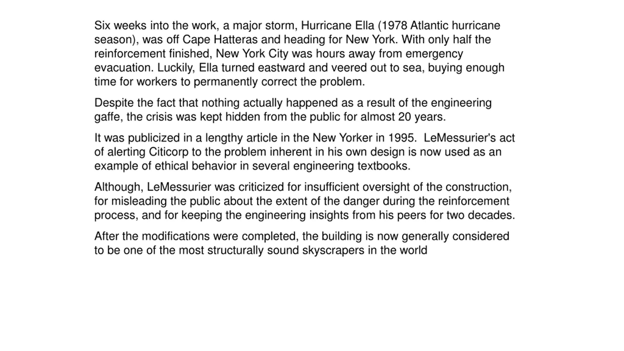 Six weeks into the work, a major storm, Hurricane Ella (1978 Atlantic hurricane season), was off Cape Hatteras and heading for New York. With only half the reinforcement finished, New York City was hours away from emergency evacuation. Luckily, Ella turned eastward and veered out to sea, buying enough time for workers to permanently correct the problem. Despite the fact that nothing actually happened as a result of the engineering gaffe, the crisis was kept hidden from the public for almost 20 years. It was publicized in a lengthy article in the New Yorker in 1995. LeMessurier's act of alerting Citicorp to the problem inherent in his own design is now used as an example of ethical behavior in several engineering textbooks. Although, LeMessurier was criticized for insufficient oversight of the construction, for misleading the public about the extent of the danger during the reinforcement process, and for keeping the engineering insights from his peers for two decades. After the modifications were completed, the building is now generally considered to be one of the most structurally sound skyscrapers in the world