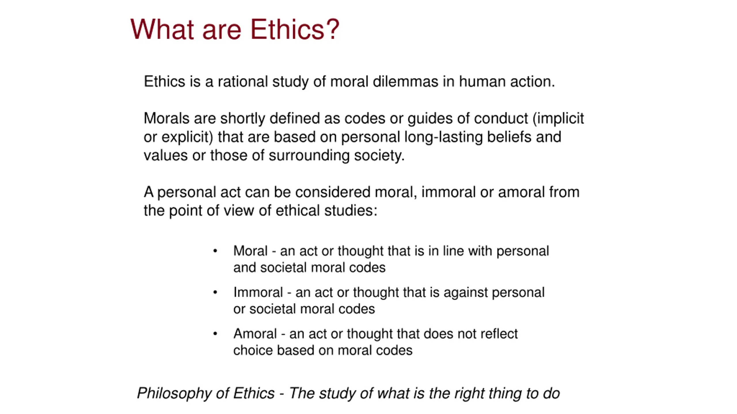 What are Ethics? Ethics is a rational study of moral dilemmas in human action. Morals are shortly defined as codes or guides of conduct (implicit or explicit) that are based on personal long-lasting beliefs and values or those of surrounding society. A personal act can be considered moral, immoral or amoral from the point of view of ethical studies: Moral - an act or thought that is in line with personal and societal moral codes Immoral - an act or thought that is against personal or societal moral codes Amoral - an act or thought that does not reflect choice based on moral codes Philosophy of Ethics - The study of what is the right thing to do