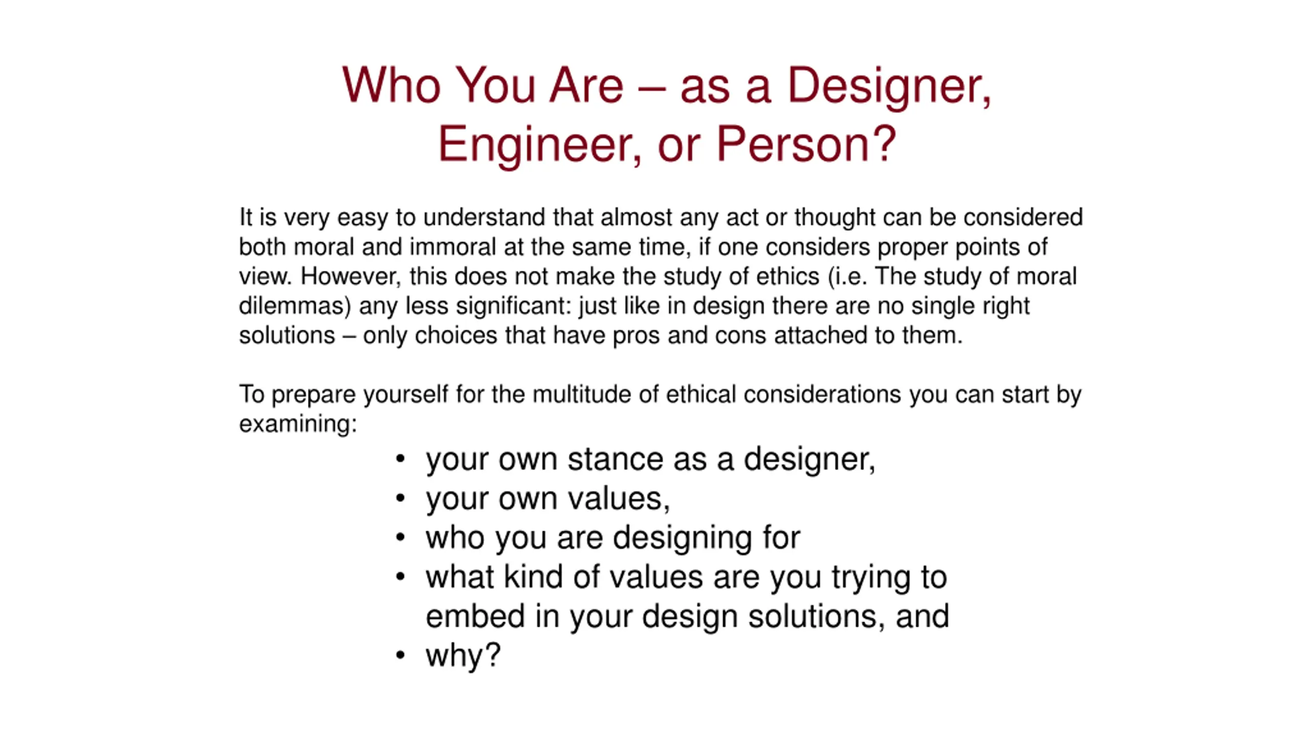 Who You Are as a Designer, Engineer, or Person? It is very easy to understand that almost any act or thought can be considered both moral and immoral at the same time, if one considers proper points of view. However, this does not make the study of ethics (i.e. The study of moral dilemmas) any less significant: just like in design there are no single right solutions only choices that have pros and cons attached to them. To prepare yourself for the multitude of ethical considerations you can start by examining: your own stance as a designer, your own values, who you are designing for what kind of values are you trying to embed in your design solutions, and why?