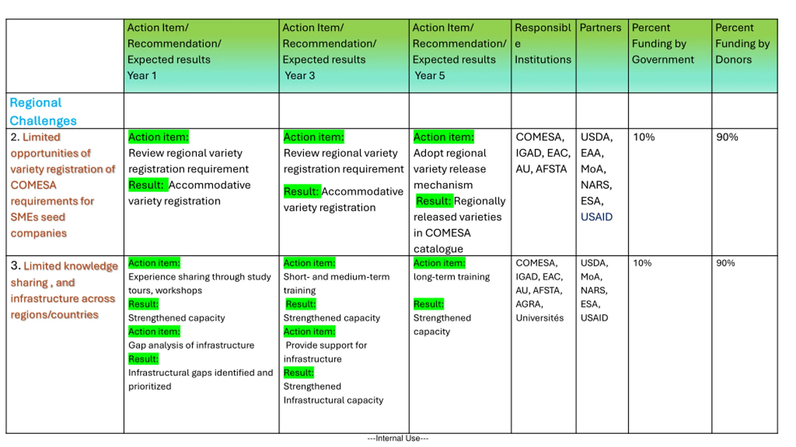 Action Item/ Recommendation/ Expected results Year 1 Action Item/ Recommendation/ Expected results Year 3 Action Item/ Recommendation/ Expected results Year 5 Responsibl e Institutions Partners Percent Percent Funding by Donors Funding by Government Regional Regional Challenges Challenges 2. Limited opportunities of variety registration of COMESA requirements for SMEs seed companies Action item: Review regional variety registration requirement Result: Accommodative variety registration Action item: Review regional variety registration requirement Action item: Adopt regional variety release mechanism Result: Regionally released varieties in COMESA catalogue Action item: long-term training COMESA, IGAD, EAC, AU, AFSTA USDA, EAA, MoA, NARS, ESA, USAID 10% 90% Result: Accommodative variety registration Action item: Experience sharing through study tours, workshops Result: Strengthened capacity Action item: Gap analysis of infrastructure Result: Infrastructural gaps identified and prioritized Action item: Short- and medium-term training Result: Strengthened capacity Action item: Provide support for infrastructure Result: Strengthened Infrastructural capacity COMESA, IGAD, EAC, AU, AFSTA, AGRA, Universit s USDA, MoA, NARS, ESA, USAID 10% 90% 3.Limited knowledge sharing , and infrastructure across regions/countries Result: Strengthened capacity ---Internal Use---