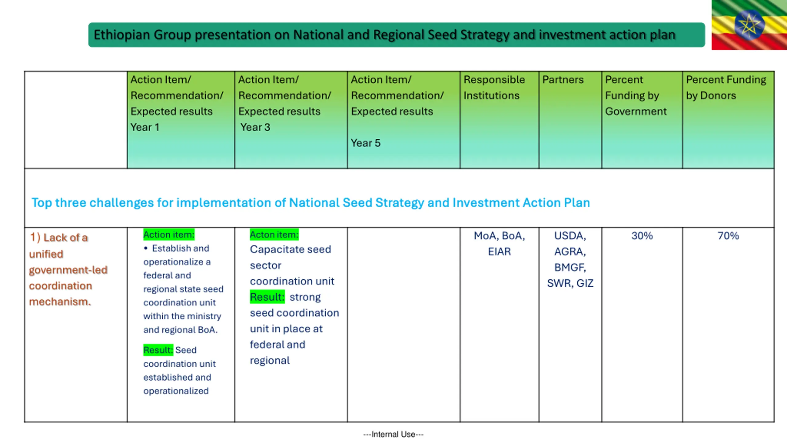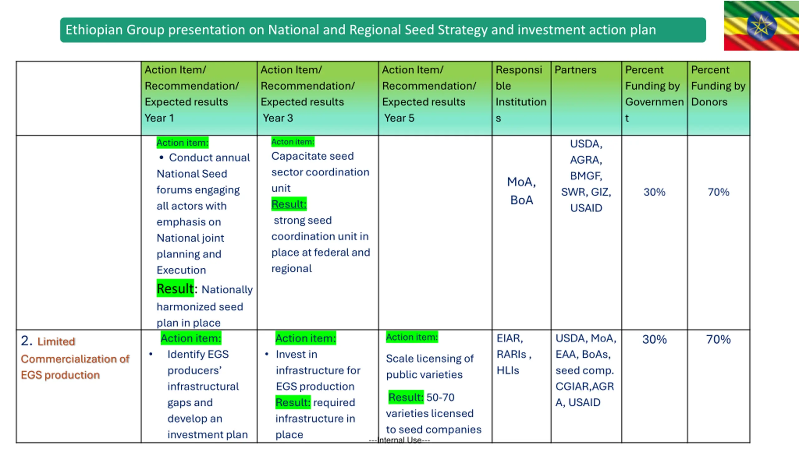 Ethiopian Group presentation on National and Regional Seed Strategy and investment action plan Action Item/ Recommendation/ Expected results Year 1 Action Item/ Recommendation/ Expected results Year 3 Action Item/ Recommendation/ Expected results Responsible Institutions Partners Percent Funding by Government Percent Funding by Donors Year 5 Top three challenges for implementation of National Seed Strategy and Investment Action Plan Top three challenges for implementation of National Seed Strategy and Investment Action Plan Action item: Establish and operationalize a federal and regional state seed coordination unit within the ministry and regional BoA. Acton item: Capacitate seed sector coordination unit Result: strong seed coordination unit in place at federal and regional MoA, BoA, EIAR USDA, AGRA, BMGF, SWR, GIZ 30% 70% 1) Lack of a unified government-led coordination mechanism. Result: Seed coordination unit established and operationalized ---Internal Use---