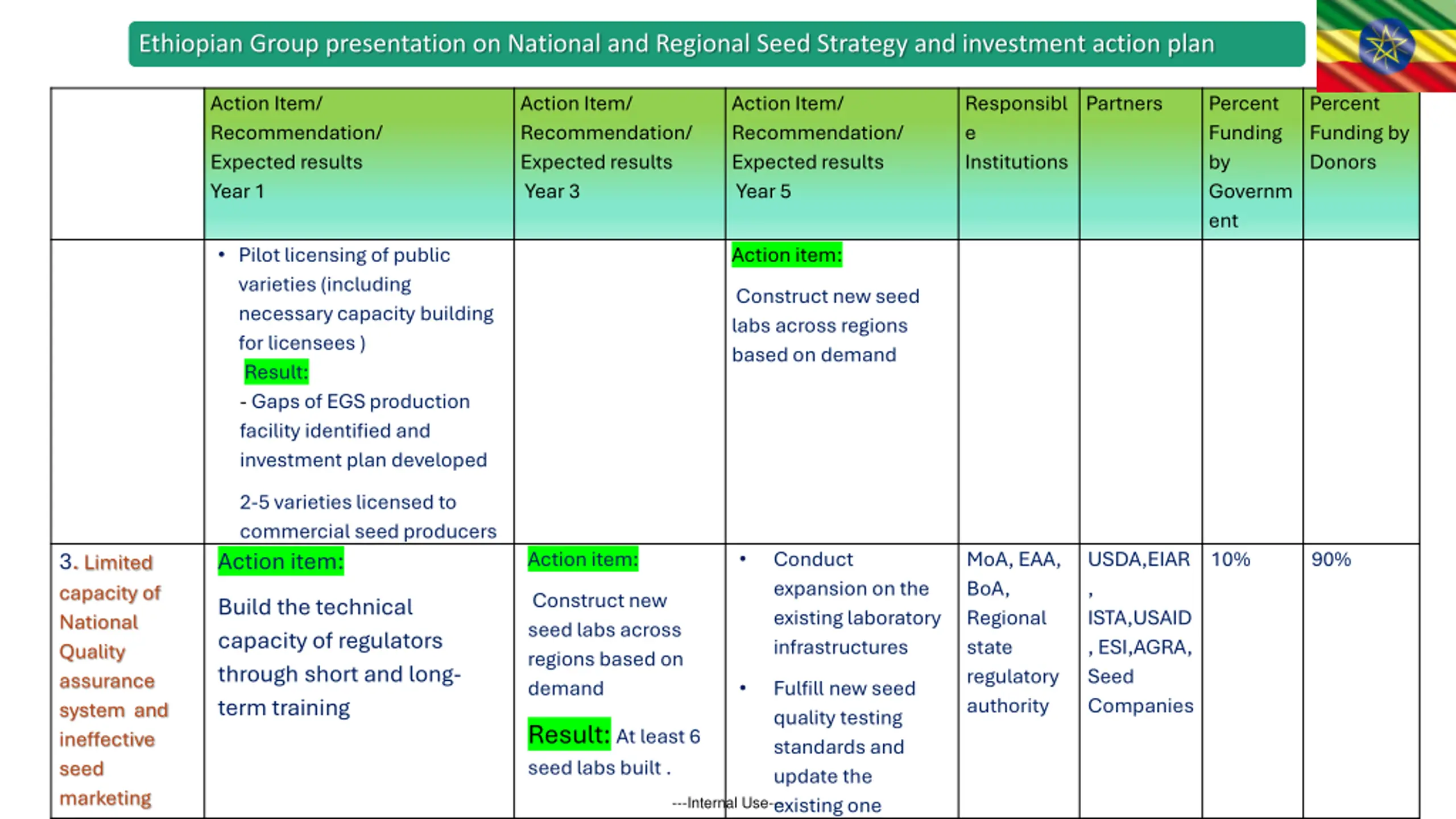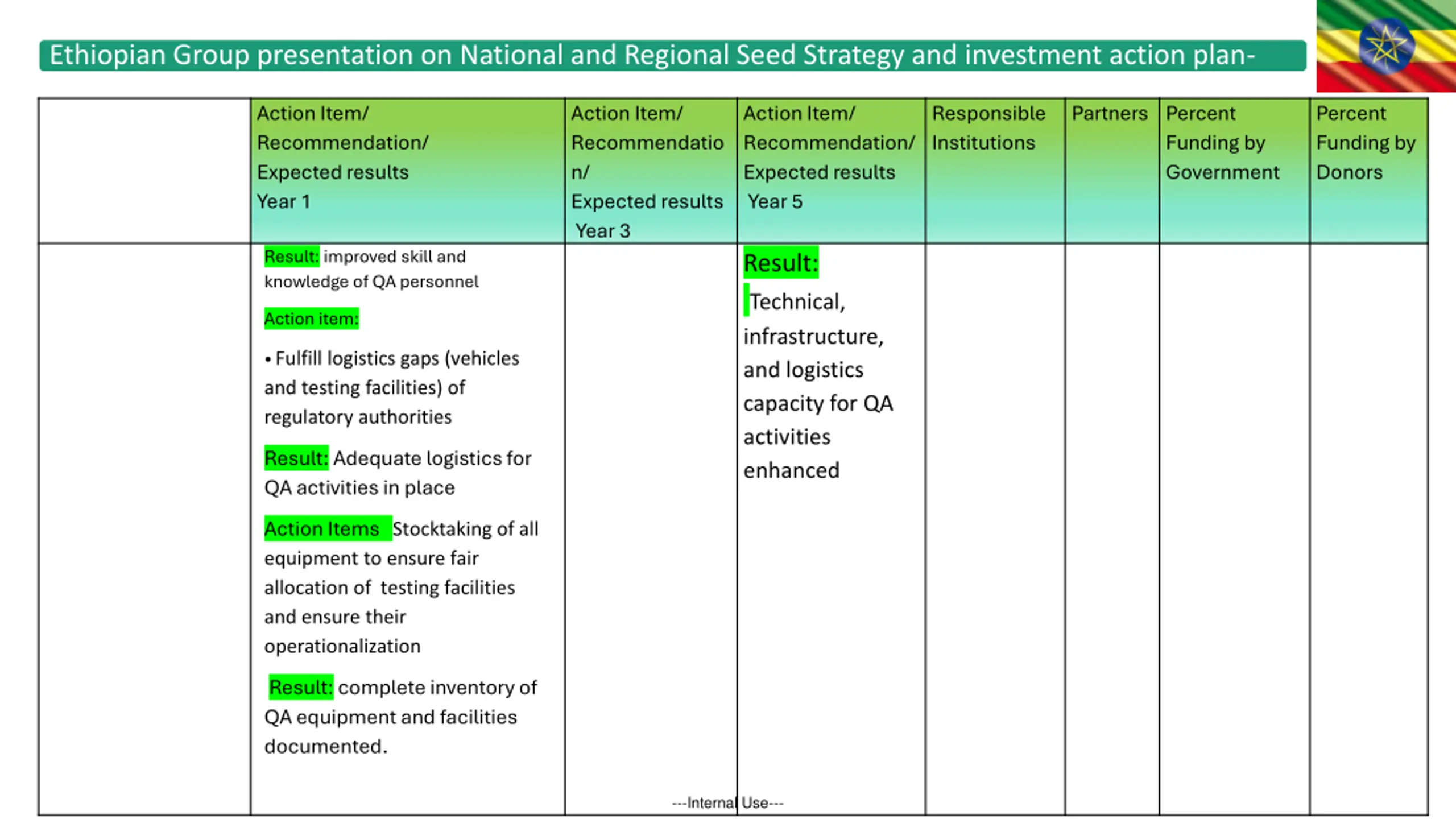 Ethiopian Group presentation on National and Regional Seed Strategy and investment action plan- Action Item/ Recommendation/ Expected results Year 1 Action Item/ Recommendatio n/ Expected results Year 3 Action Item/ Recommendation/ Expected results Year 5 Responsible Institutions Partners Percent Percent Funding by Donors Funding by Government Result: improved skill and knowledge of QA personnel Result: Technical, infrastructure, and logistics capacity for QA activities enhanced Action item: Fulfill logistics gaps (vehicles and testing facilities) of regulatory authorities Result:Adequate logistics for QA activities in place Action Items Stocktaking of all equipment to ensure fair allocation of testing facilities and ensure their operationalization Result:complete inventory of QA equipment and facilities documented. ---Internal Use---