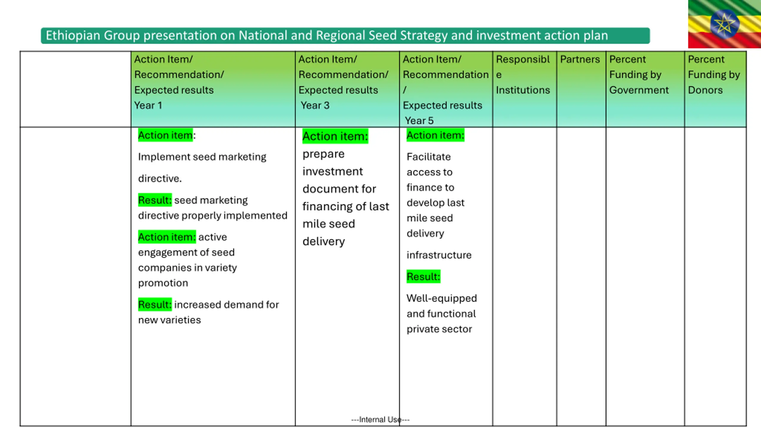 Ethiopian Group presentation on National and Regional Seed Strategy and investment action plan Action Item/ Recommendation/ Expected results Year 1 Action Item/ Recommendation/ Expected results Year 3 Action Item/ Recommendation / Expected results Year 5 Action item: Responsibl e Institutions Partners Percent Percent Funding by Donors Funding by Government Action item: Action item: prepare investment document for financing of last mile seed delivery Implement seed marketing Facilitate access to finance to develop last mile seed delivery directive. Result:seed marketing directive properly implemented Action item: active engagement of seed companies in variety promotion infrastructure Result: Well-equipped and functional private sector Result:increased demand for new varieties ---Internal Use---