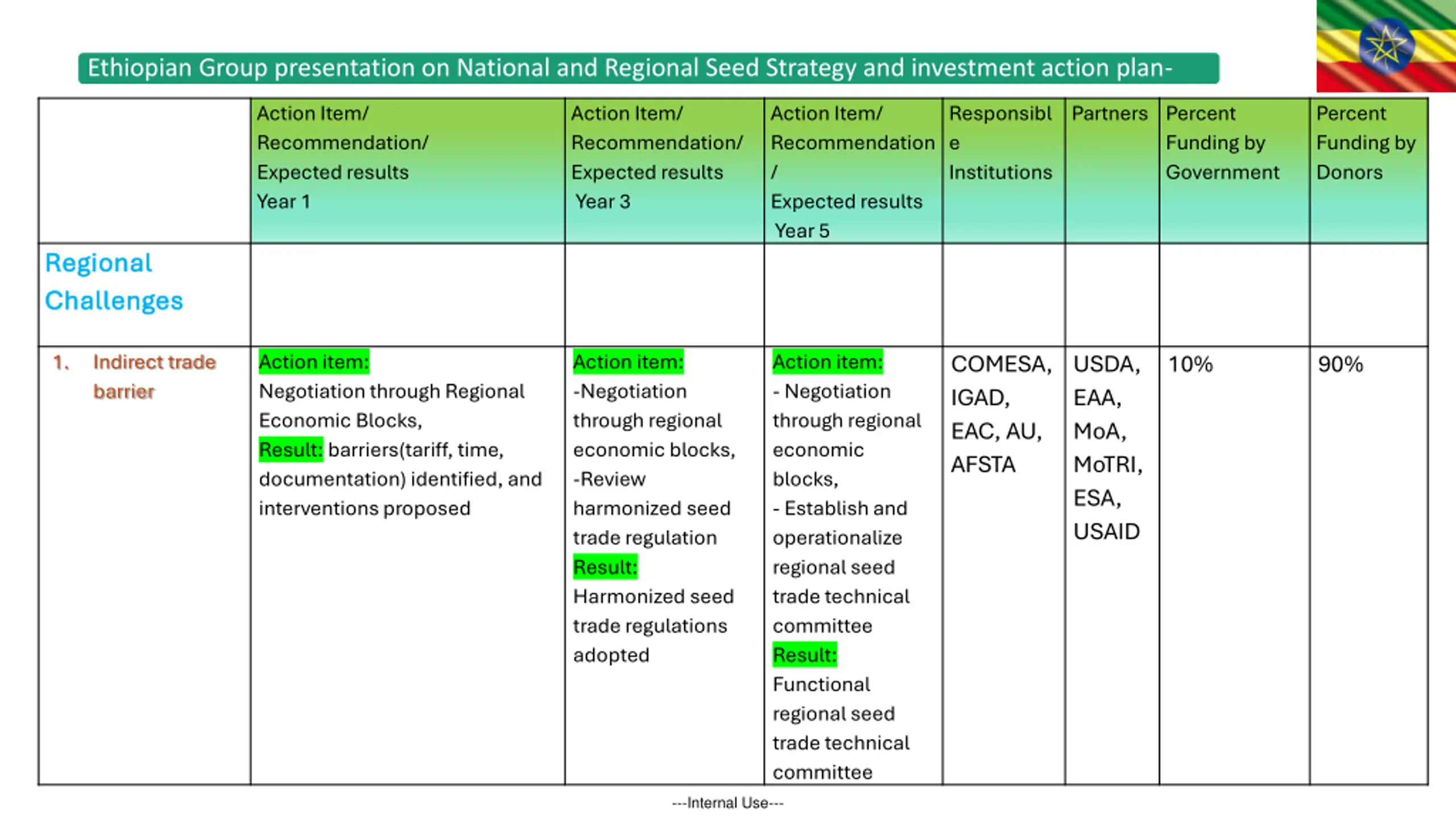 Ethiopian Group presentation on National and Regional Seed Strategy and investment action plan- Action Item/ Recommendation/ Expected results Year 1 Action Item/ Recommendation/ Expected results Year 3 Action Item/ Recommendation / Expected results Year 5 Responsibl e Institutions Partners Percent Percent Funding by Donors Funding by Government Regional Regional Challenges Challenges 1. Indirect trade barrier Action item: Negotiation through Regional Economic Blocks, Result:barriers(tariff, time, documentation) identified, and interventions proposed Action item: -Negotiation through regional economic blocks, -Review harmonized seed trade regulation Result: Harmonized seed trade regulations adopted Action item: - Negotiation through regional economic blocks, - Establish and operationalize regional seed trade technical committee Result: Functional regional seed trade technical committee COMESA, IGAD, EAC, AU, AFSTA USDA, EAA, MoA, MoTRI, ESA, USAID 10% 90% ---Internal Use---