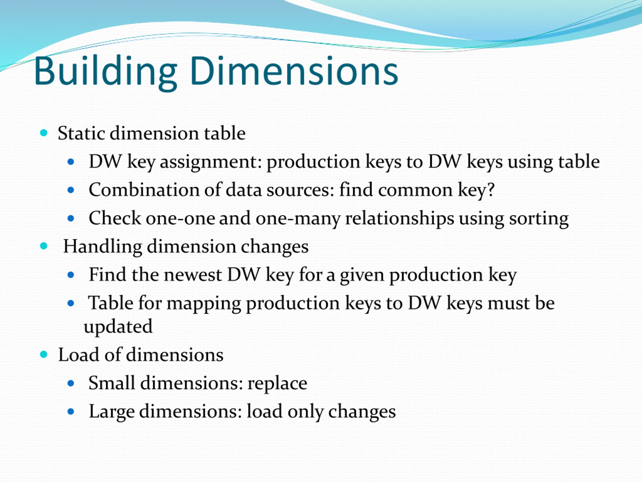 Building Dimensions Static dimension table DW key assignment: production keys to DW keys using table Combination of data sources: find common key? Check one-one and one-many relationships using sorting Handling dimension changes Find the newest DW key for a given production key Table for mapping production keys to DW keys must be updated Load of dimensions Small dimensions: replace Large dimensions: load only changes