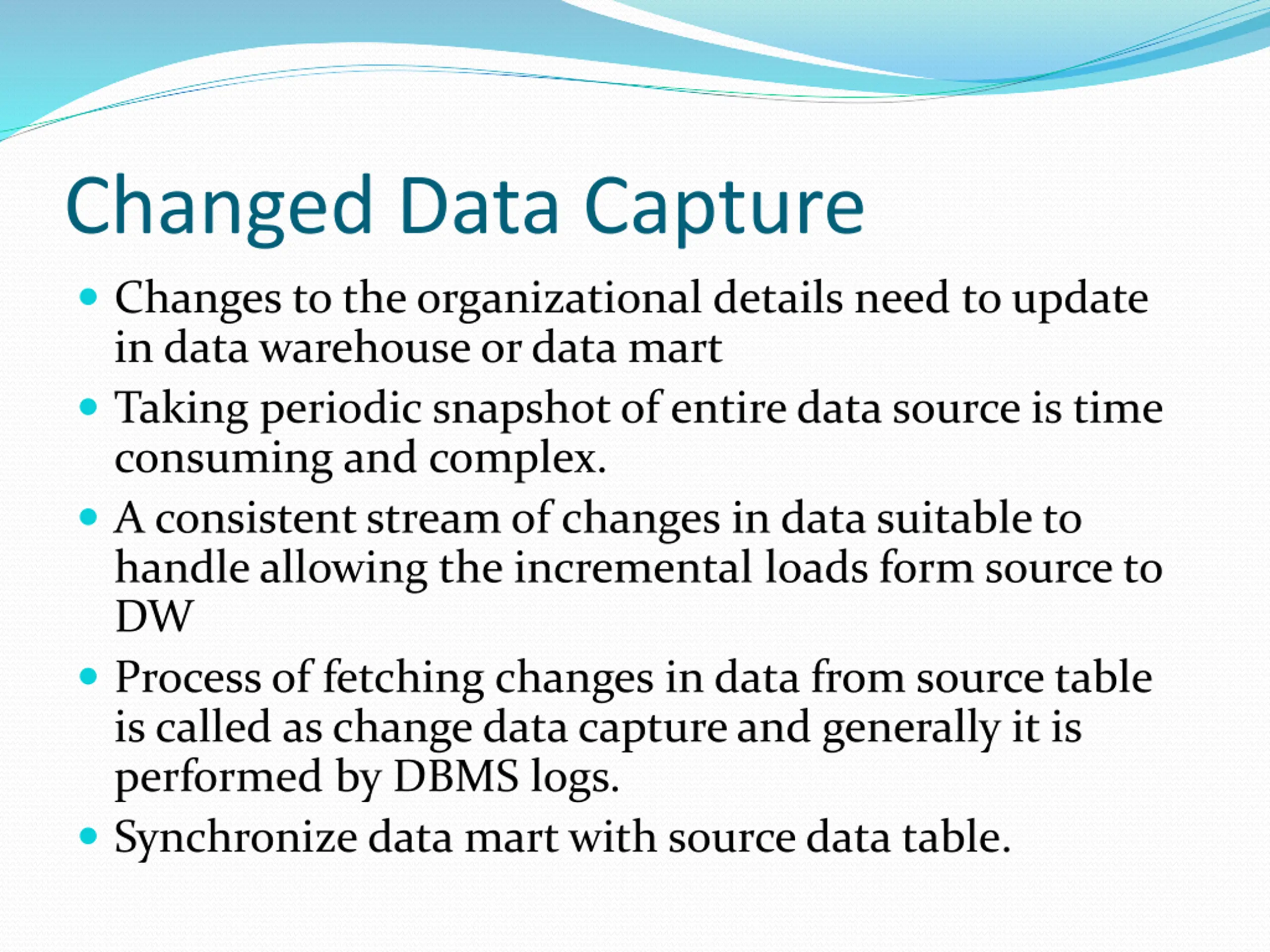 Changed Data Capture Changes to the organizational details need to update in data warehouse or data mart Taking periodic snapshot of entire data source is time consuming and complex. A consistent stream of changes in data suitable to handle allowing the incremental loads form source to DW Process of fetching changes in data from source table is called as change data capture and generally it is performed by DBMS logs. Synchronize data mart with source data table.