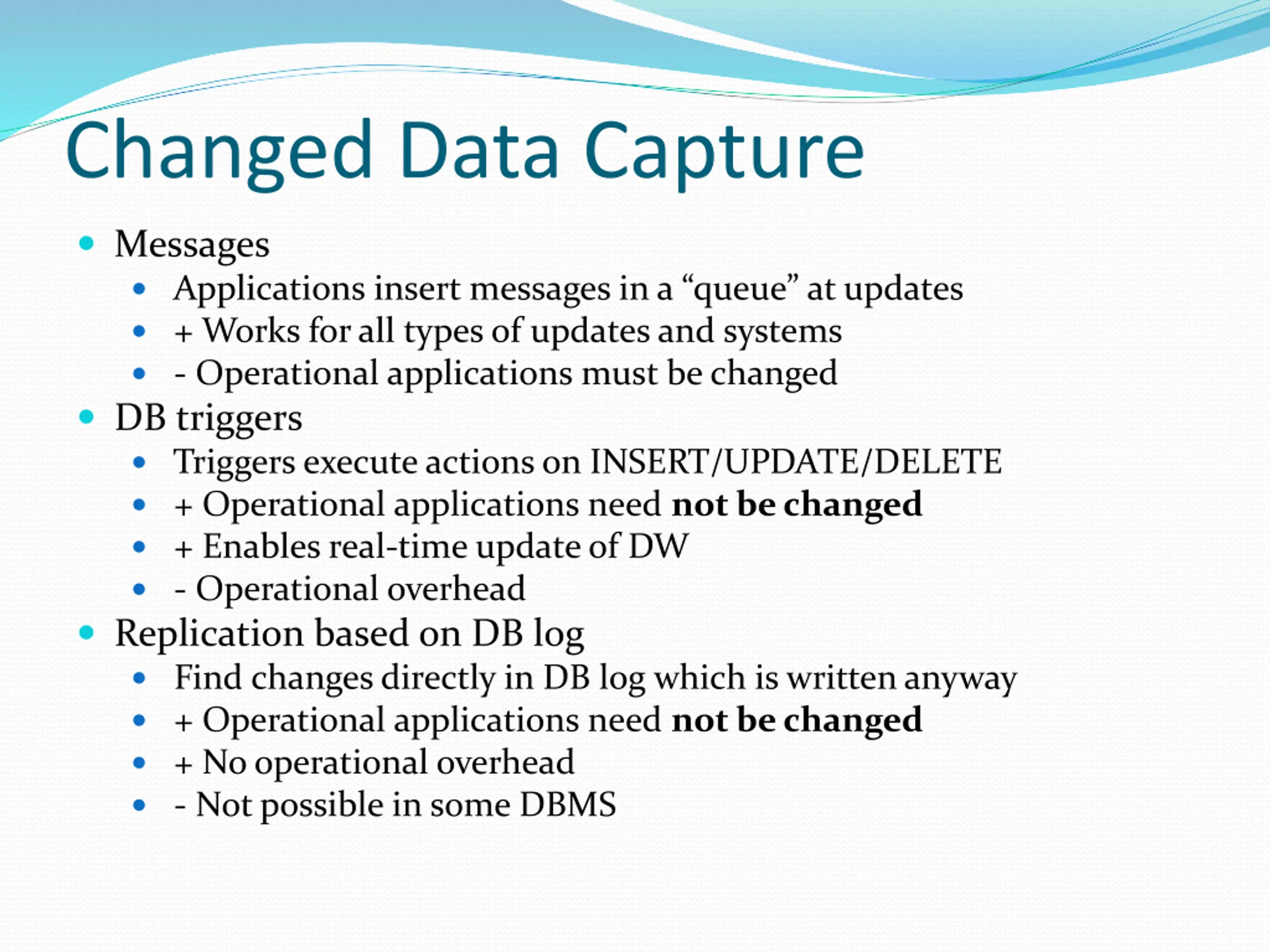 Changed Data Capture Messages Applications insert messages in a queue at updates + Works for all types of updates and systems - Operational applications must be changed DB triggers Triggers execute actions on INSERT/UPDATE/DELETE + Operational applications need not be changed + Enables real-time update of DW - Operational overhead Replication based on DB log Find changes directly in DB log which is written anyway + Operational applications need not be changed + No operational overhead - Not possible in some DBMS