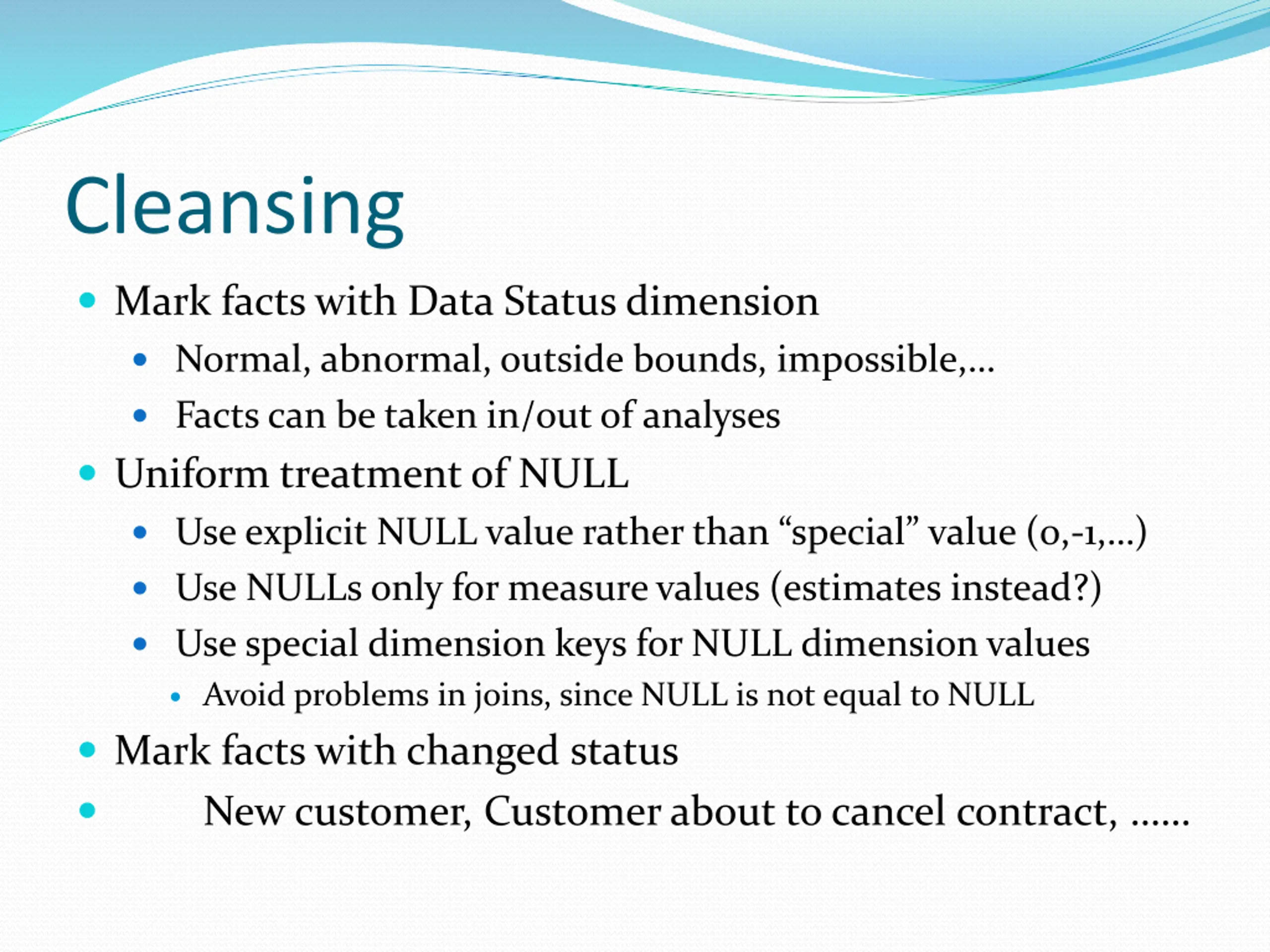Cleansing Mark facts with Data Status dimension Normal, abnormal, outside bounds, impossible, Facts can be taken in/out of analyses Uniform treatment of NULL Use explicit NULL value rather than special value (0,-1, ) Use NULLs only for measure values (estimates instead?) Use special dimension keys for NULL dimension values Avoid problems in joins, since NULL is not equal to NULL Mark facts with changed status New customer, Customer about to cancel contract,