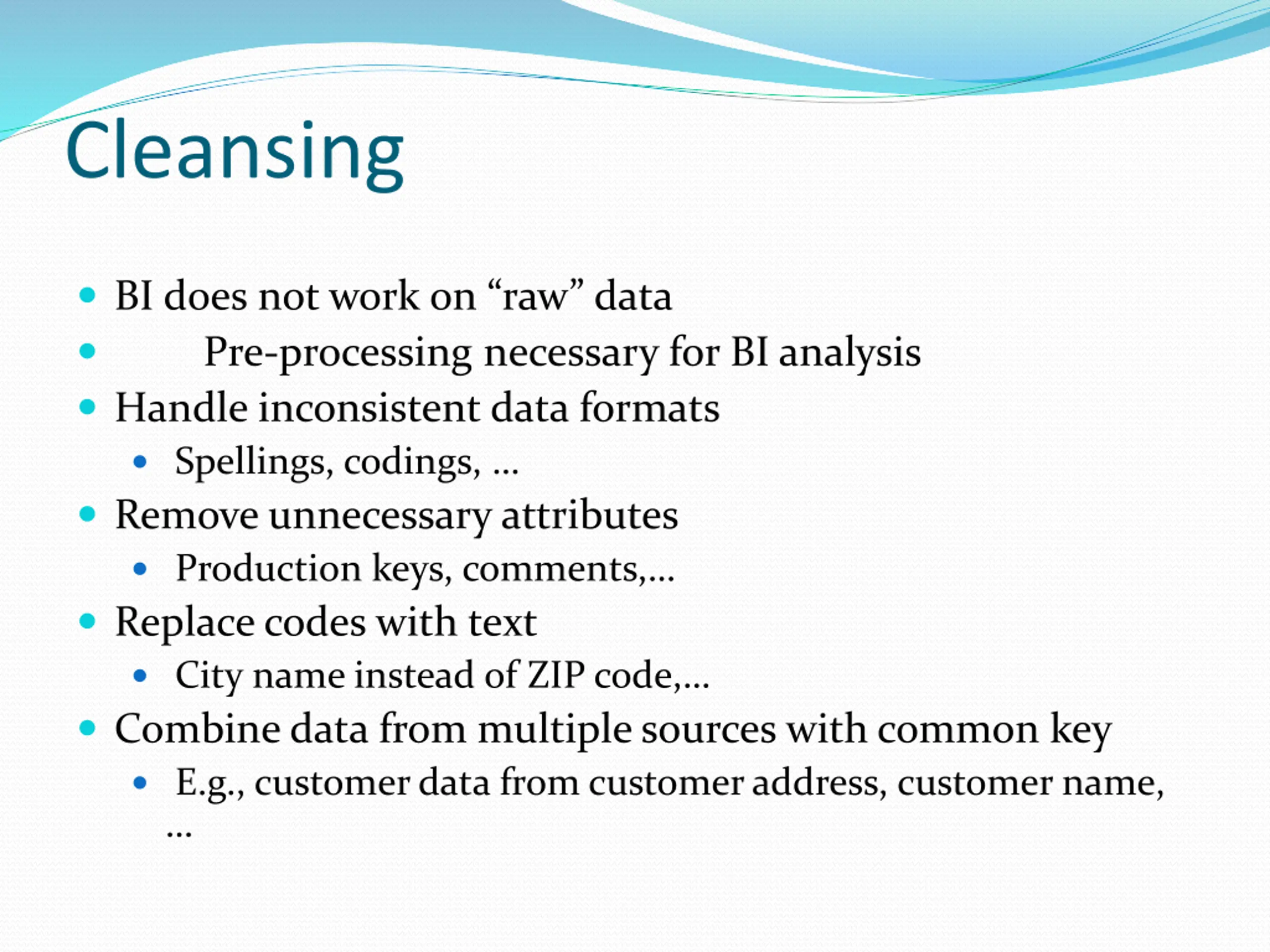 Cleansing BI does not work on raw data Pre-processing necessary for BI analysis Handle inconsistent data formats Spellings, codings, Remove unnecessary attributes Production keys, comments, Replace codes with text City name instead of ZIP code, Combine data from multiple sources with common key E.g., customer data from customer address, customer name,