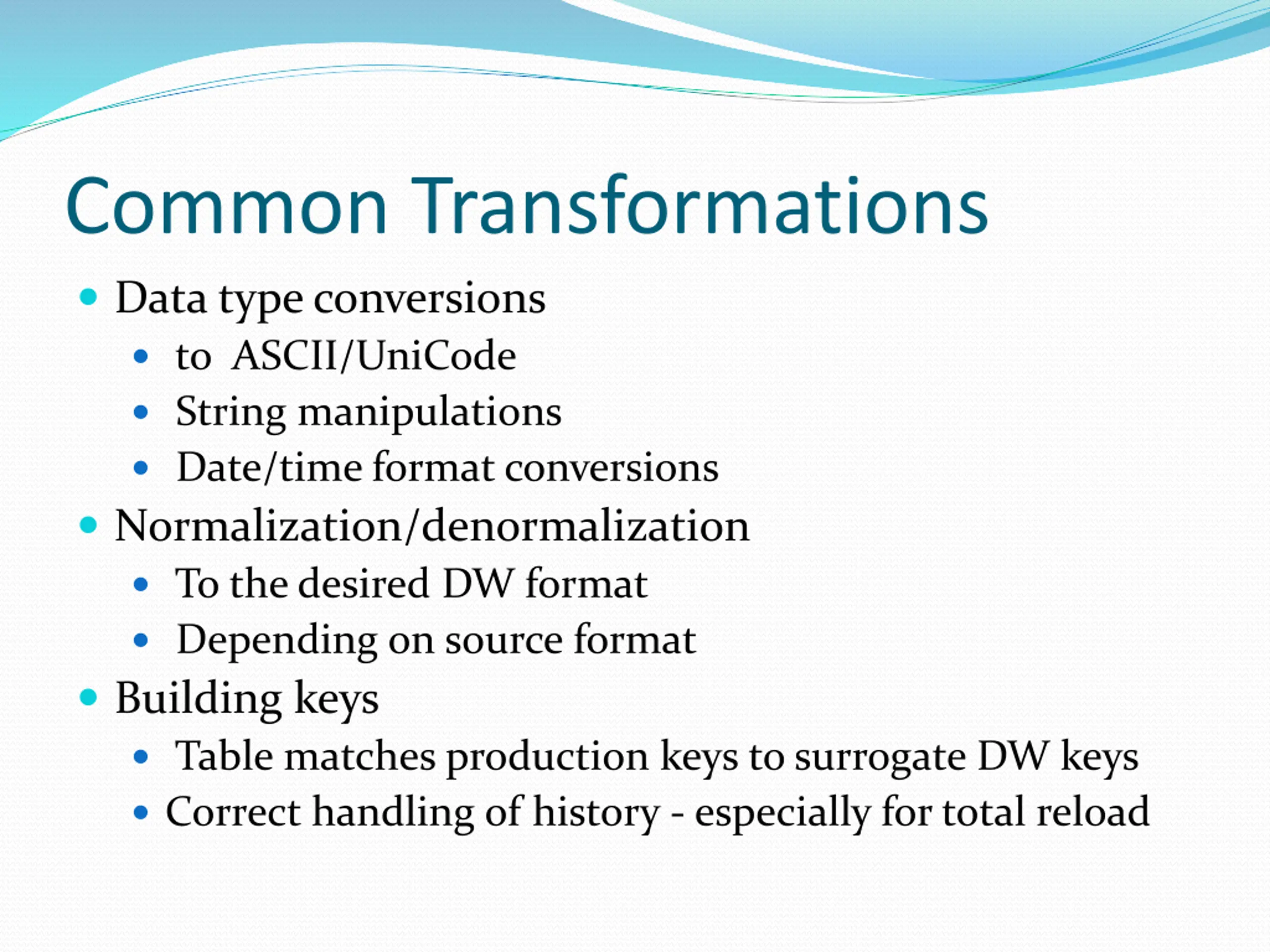 Common Transformations Data type conversions to ASCII/UniCode String manipulations Date/time format conversions Normalization/denormalization To the desired DW format Depending on source format Building keys Table matches production keys to surrogate DW keys Correct handling of history - especially for total reload