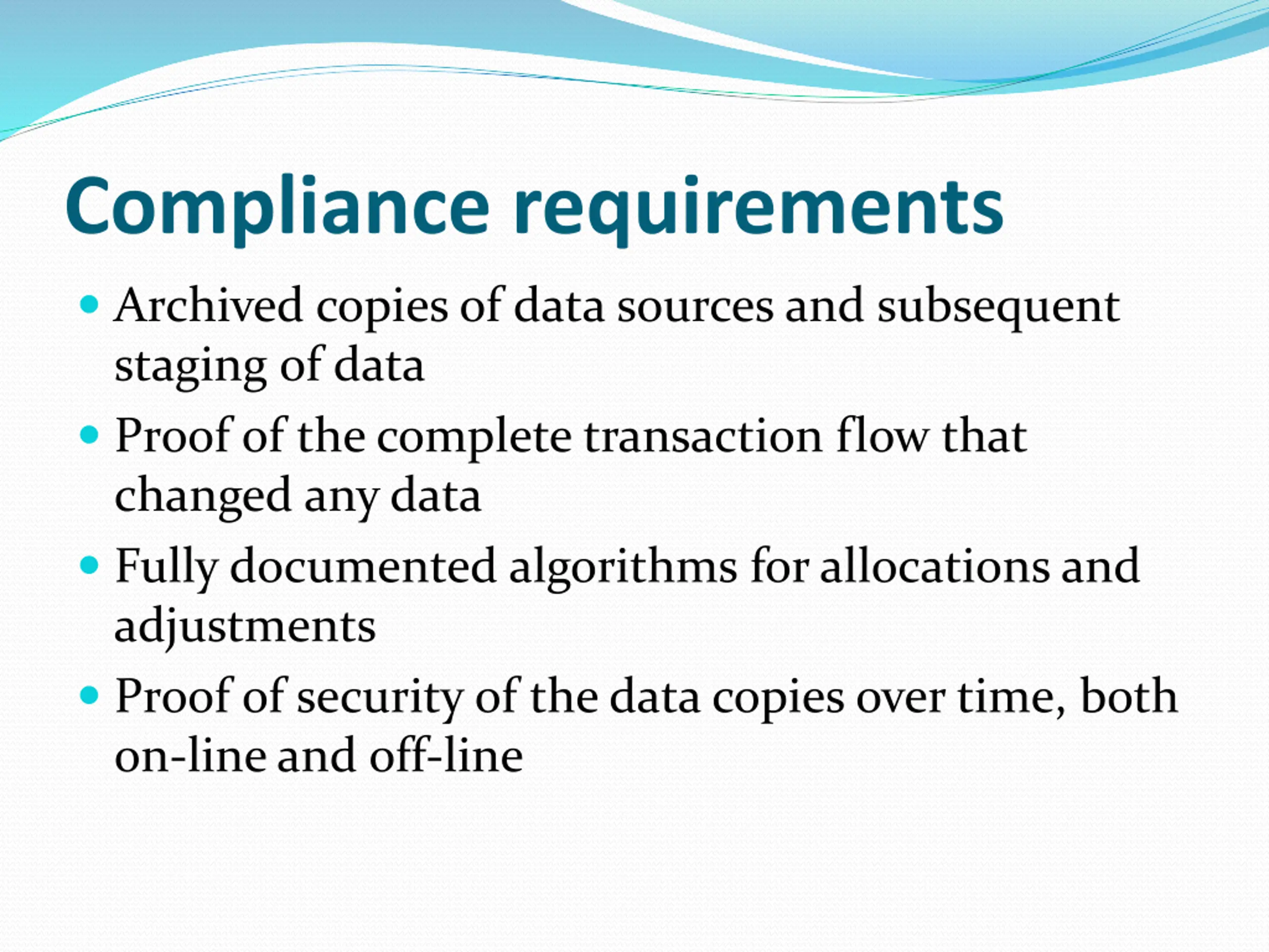 Compliance requirements Archived copies of data sources and subsequent staging of data Proof of the complete transaction flow that changed any data Fully documented algorithms for allocations and adjustments Proof of security of the data copies over time, both on-line and off-line