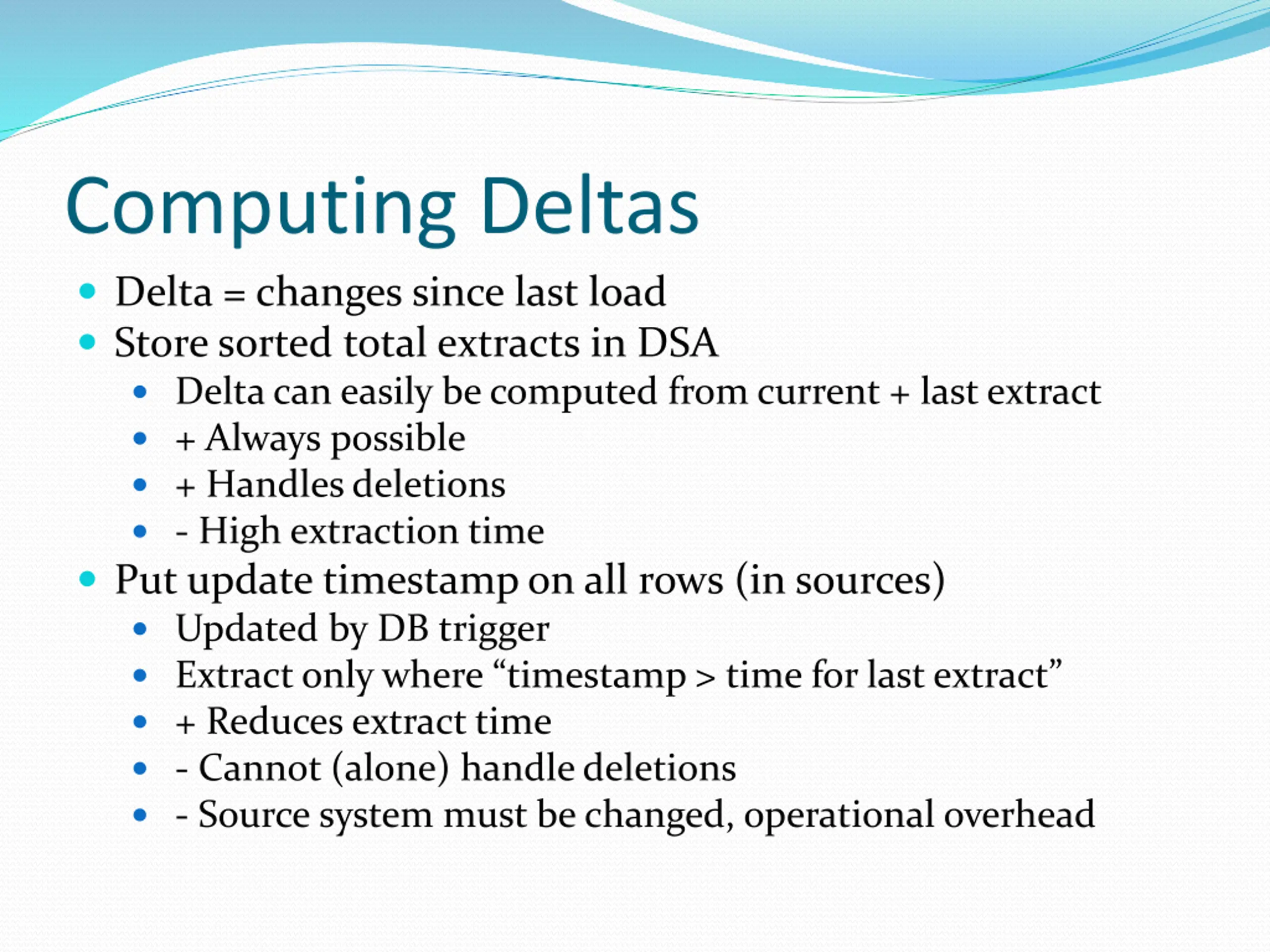 Computing Deltas Delta = changes since last load Store sorted total extracts in DSA Delta can easily be computed from current + last extract + Always possible + Handles deletions - High extraction time Put update timestamp on all rows (in sources) Updated by DB trigger Extract only where timestamp > time for last extract + Reduces extract time - Cannot (alone) handle deletions - Source system must be changed, operational overhead