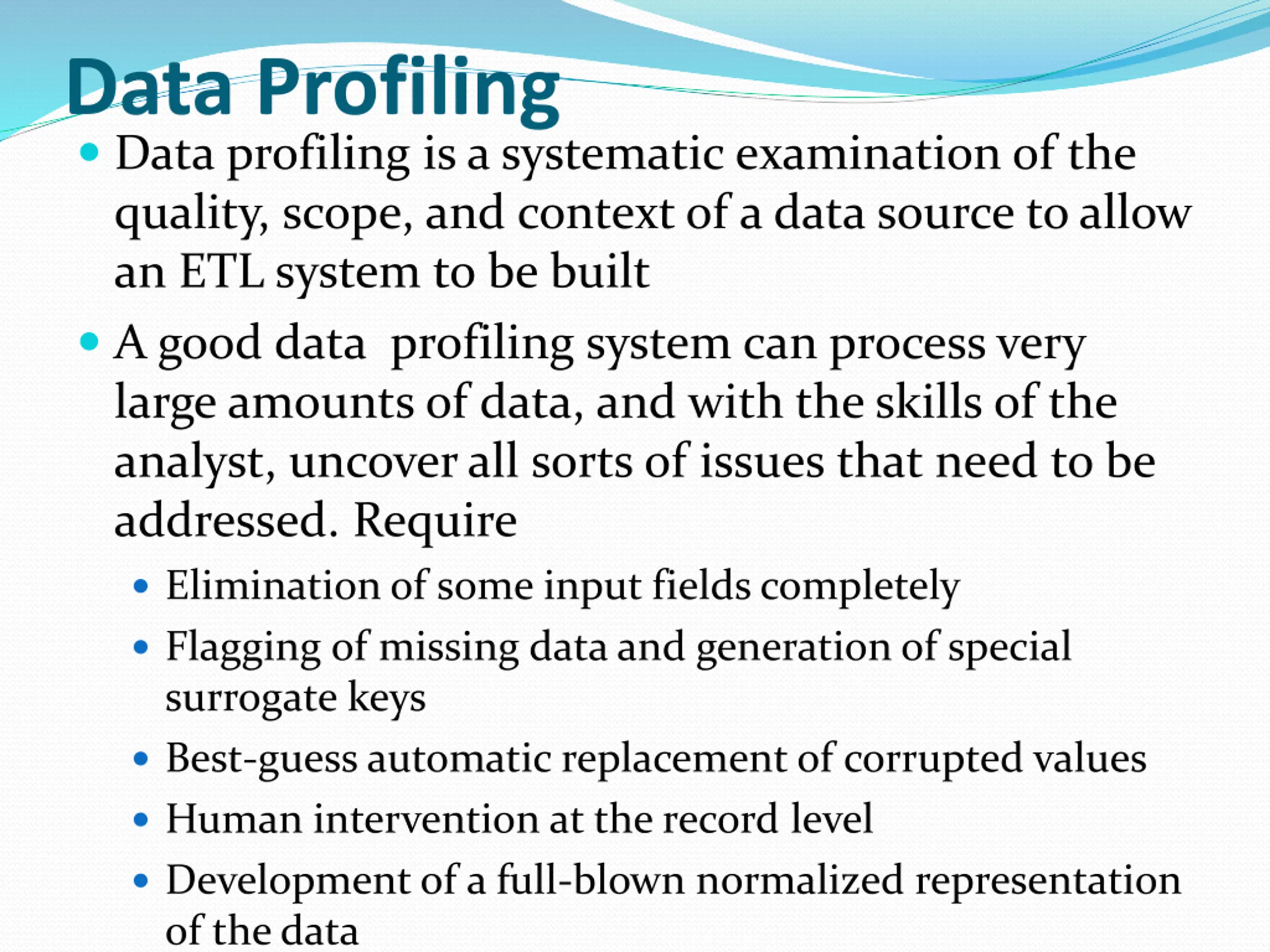 Data Profiling Data profiling is a systematic examination of the quality, scope, and context of a data source to allow an ETL system to be built A good data profiling system can process very large amounts of data, and with the skills of the analyst, uncover all sorts of issues that need to be addressed. Require Elimination of some input fields completely Flagging of missing data and generation of special surrogate keys Best-guess automatic replacement of corrupted values Human intervention at the record level Development of a full-blown normalized representation of the data