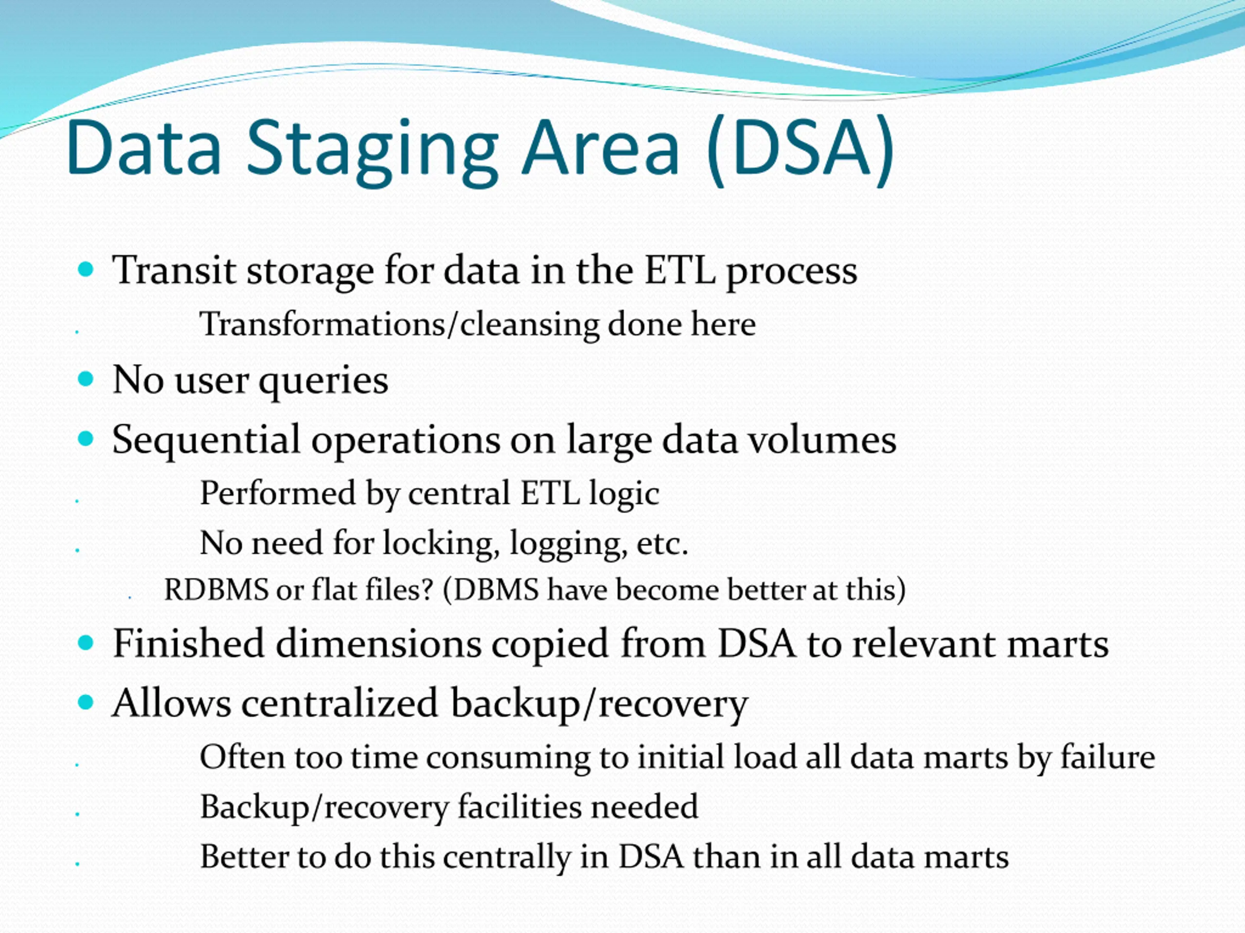 Data Staging Area (DSA) Transit storage for data in the ETL process Transformations/cleansing done here No user queries Sequential operations on large data volumes Performed by central ETL logic No need for locking, logging, etc. RDBMS or flat files? (DBMS have become better at this) Finished dimensions copied from DSA to relevant marts Allows centralized backup/recovery Often too time consuming to initial load all data marts by failure Backup/recovery facilities needed Better to do this centrally in DSA than in all data marts