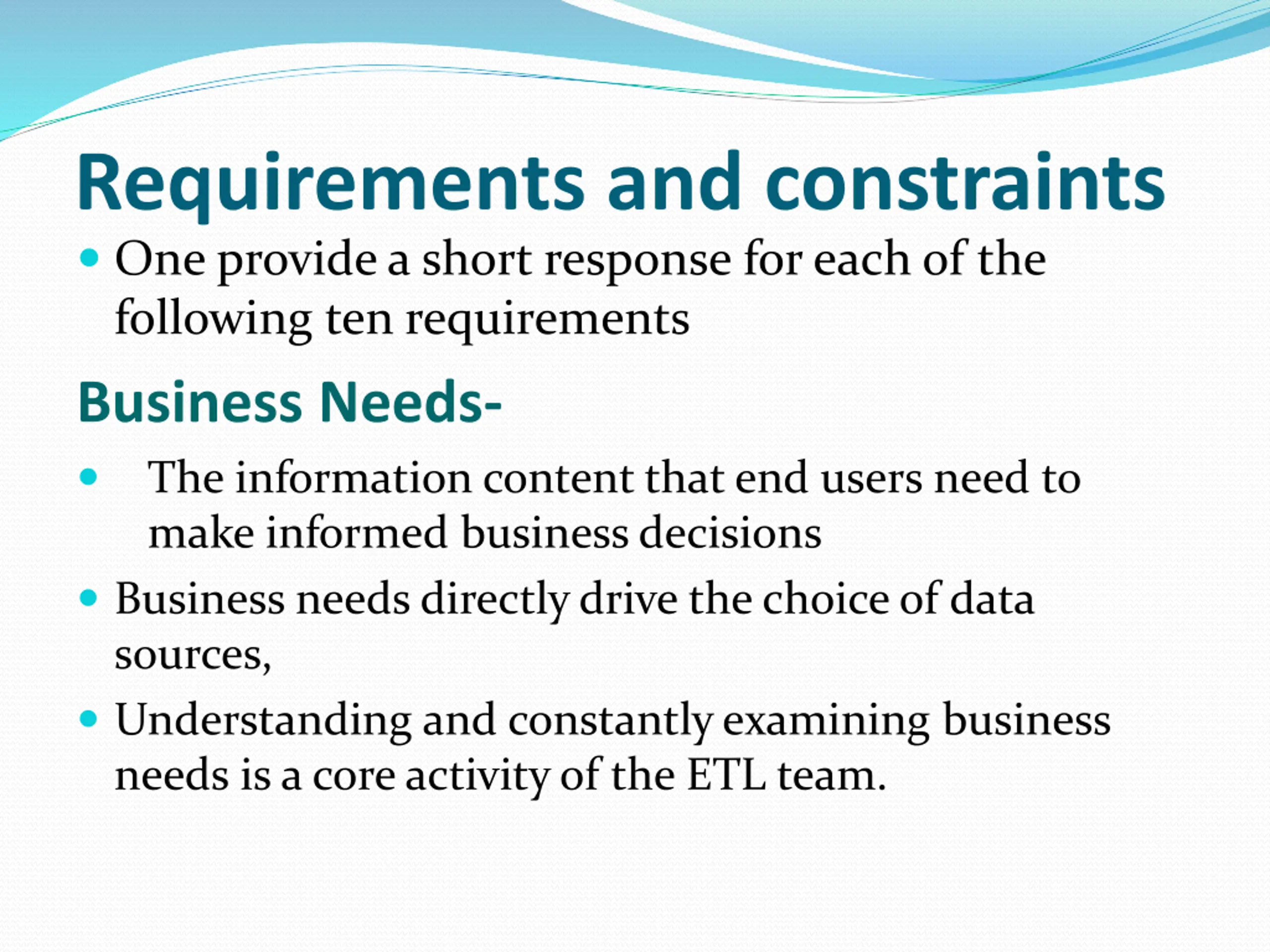 Requirements and constraints One provide a short response for each of the following ten requirements Business Needs- The information content that end users need to make informed business decisions Business needs directly drive the choice of data sources, Understanding and constantly examining business needs is a core activity of the ETL team.