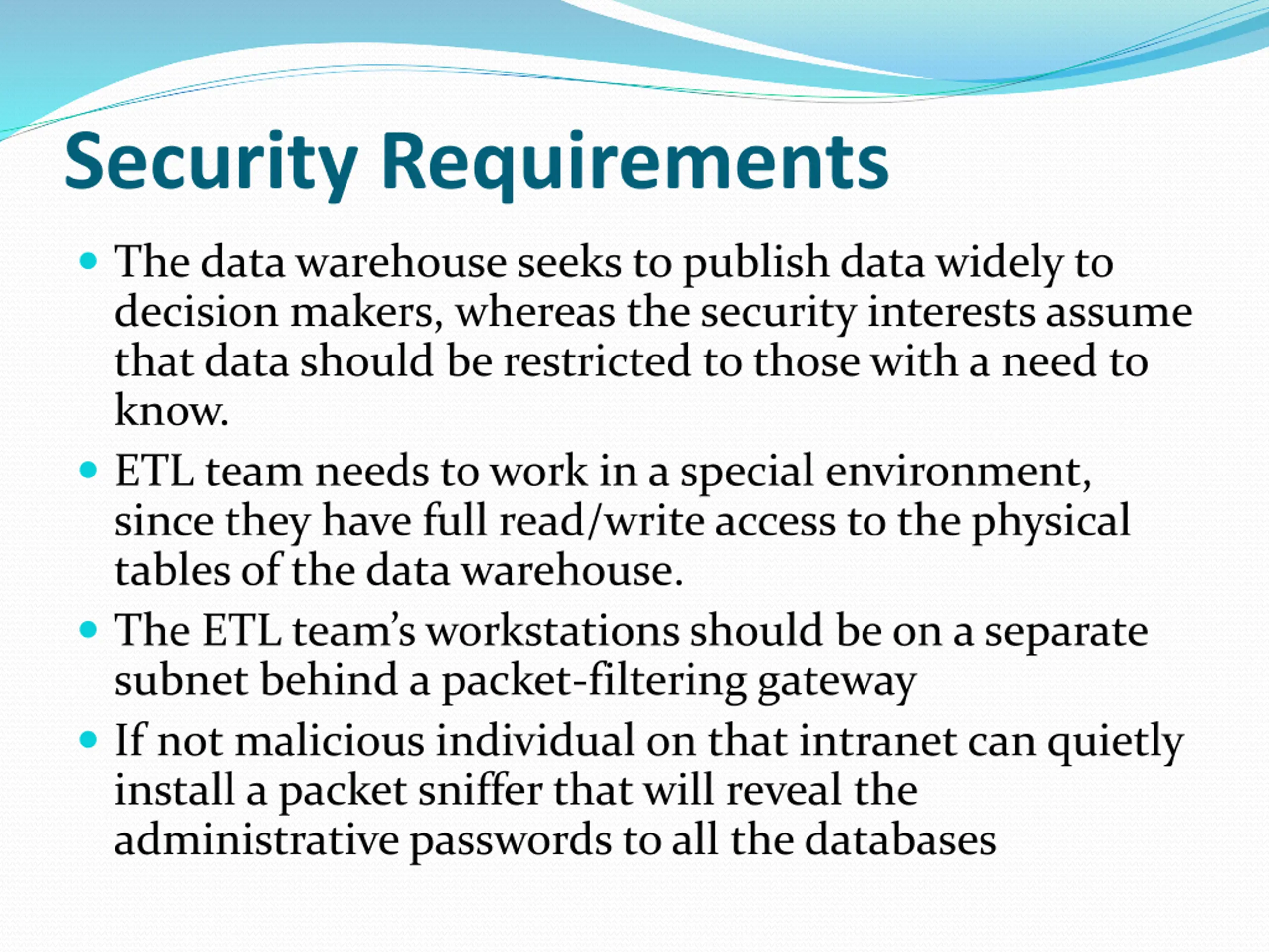 Security Requirements The data warehouse seeks to publish data widely to decision makers, whereas the security interests assume that data should be restricted to those with a need to know. ETL team needs to work in a special environment, since they have full read/write access to the physical tables of the data warehouse. The ETL team s workstations should be on a separate subnet behind a packet-filtering gateway If not malicious individual on that intranet can quietly install a packet sniffer that will reveal the administrative passwords to all the databases