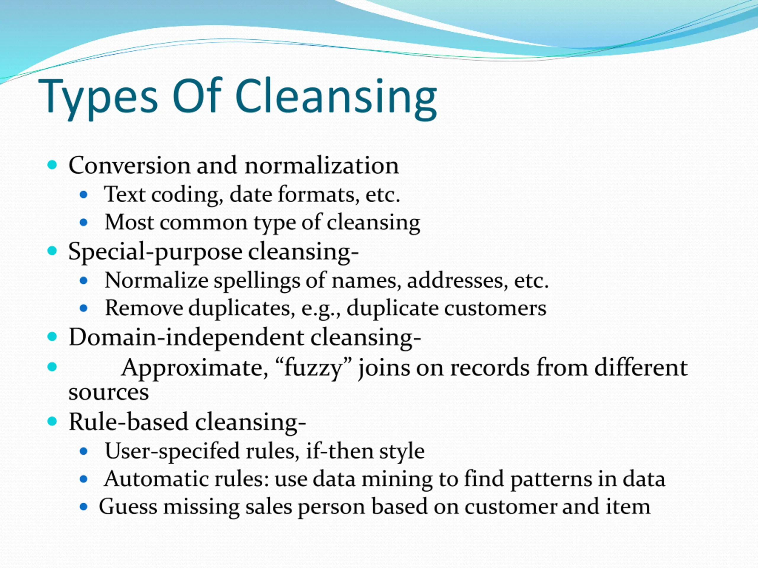Types Of Cleansing Conversion and normalization Text coding, date formats, etc. Most common type of cleansing Special-purpose cleansing- Normalize spellings of names, addresses, etc. Remove duplicates, e.g., duplicate customers Domain-independent cleansing- Approximate, fuzzy joins on records from different sources Rule-based cleansing- User-specifed rules, if-then style Automatic rules: use data mining to find patterns in data Guess missing sales person based on customer and item