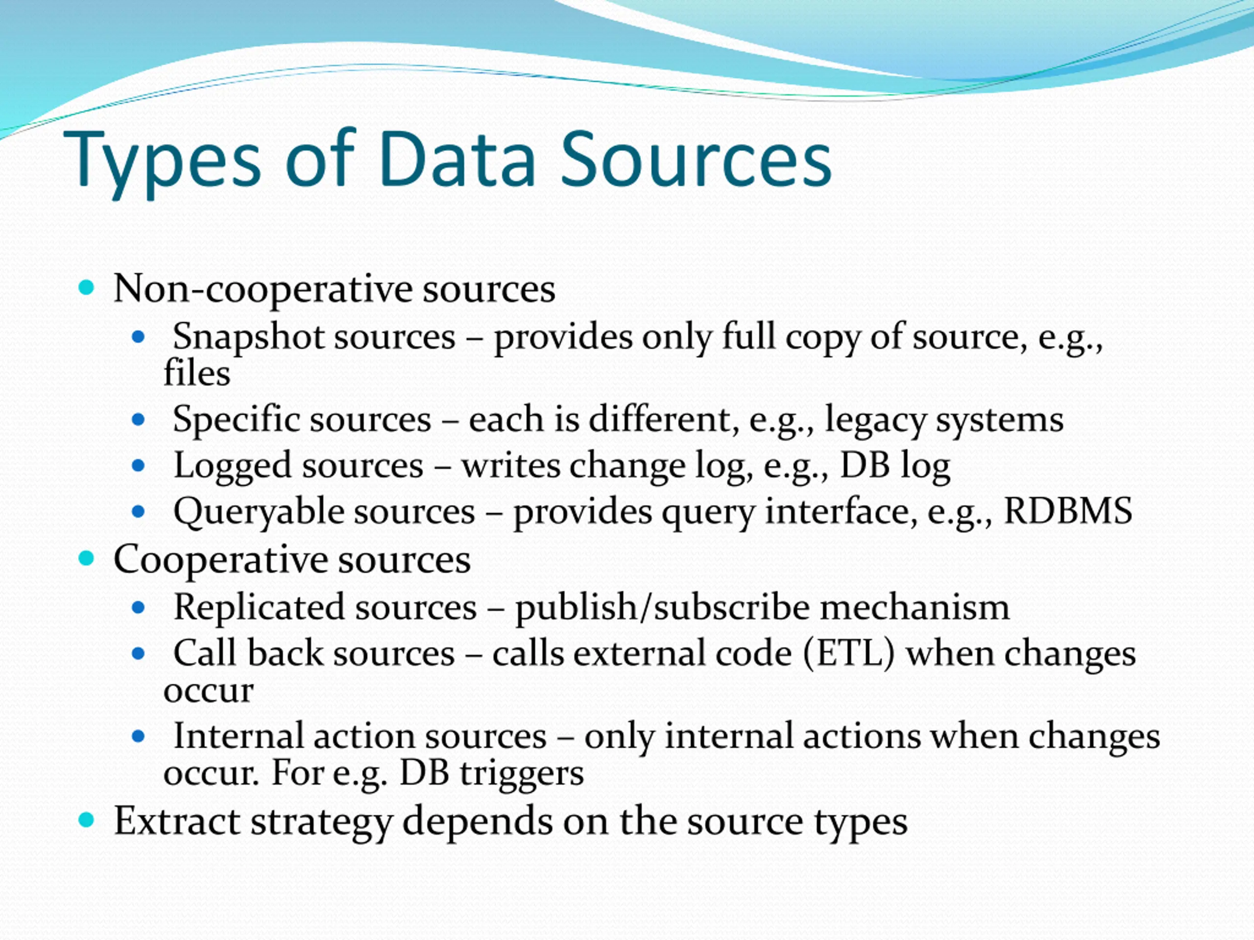 Types of Data Sources Non-cooperative sources Snapshot sources provides only full copy of source, e.g., files Specific sources each is different, e.g., legacy systems Logged sources writes change log, e.g., DB log Queryable sources provides query interface, e.g., RDBMS Cooperative sources Replicated sources publish/subscribe mechanism Call back sources calls external code (ETL) when changes occur Internal action sources only internal actions when changes occur. For e.g. DB triggers Extract strategy depends on the source types