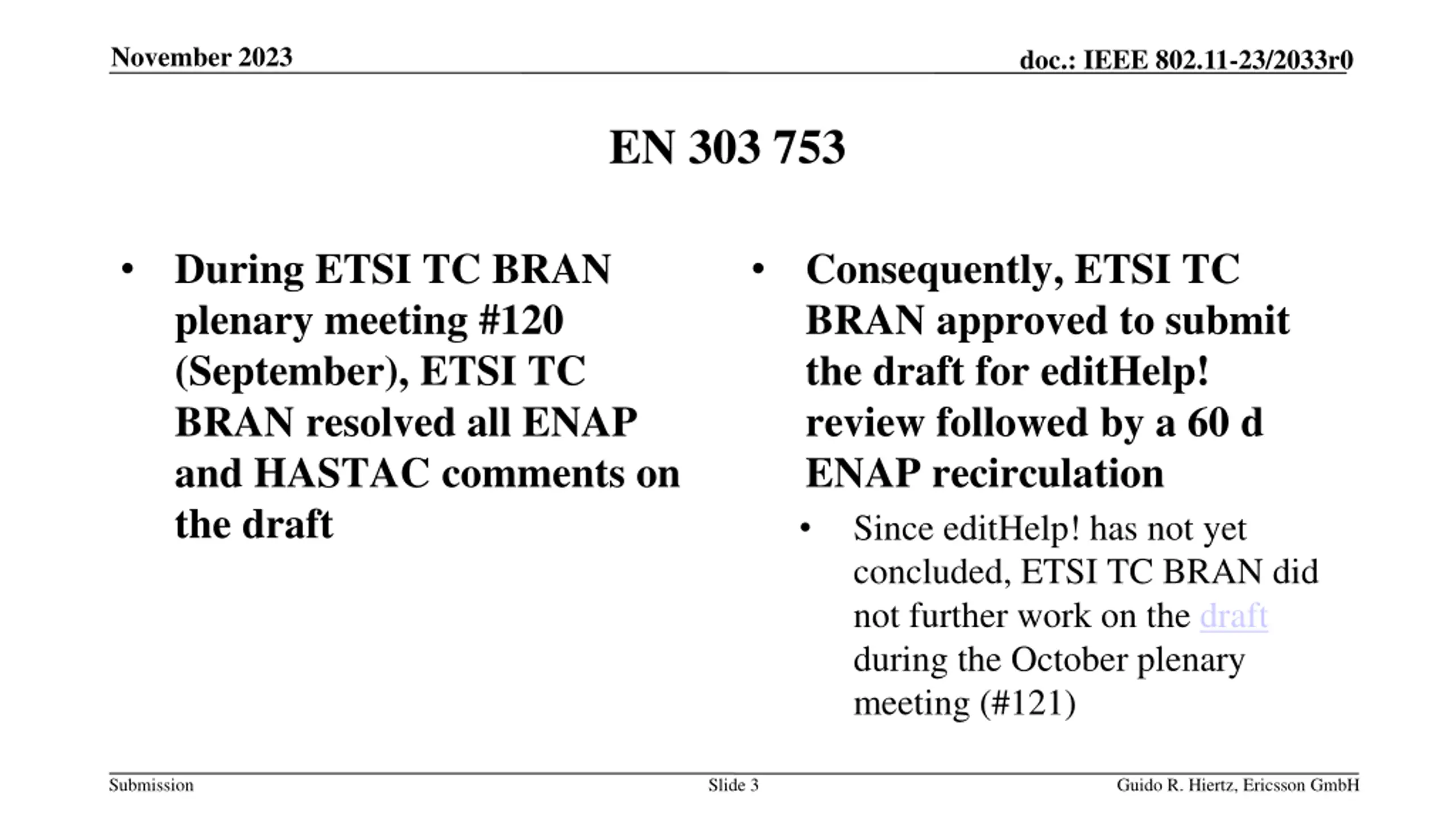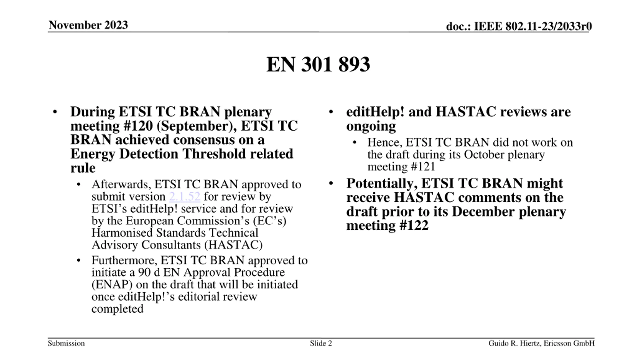 November 2023 doc.: IEEE 802.11-23/2033r0 EN 301 893 During ETSI TC BRAN plenary meeting #120 (September), ETSI TC BRAN achieved consensus on a Energy Detection Threshold related rule Afterwards, ETSI TC BRAN approved to submit version 2.1.52 for review by ETSI s editHelp! service and for review by the European Commission s (EC s) Harmonised Standards Technical Advisory Consultants (HASTAC) Furthermore, ETSI TC BRAN approved to initiate a 90 d EN Approval Procedure (ENAP) on the draft that will be initiated once editHelp! s editorial review completed editHelp! and HASTAC reviews are ongoing Hence, ETSI TC BRAN did not work on the draft during its October plenary meeting #121 Potentially, ETSI TC BRAN might receive HASTAC comments on the draft prior to its December plenary meeting #122 Submission Slide 2 Guido R. Hiertz, Ericsson GmbH