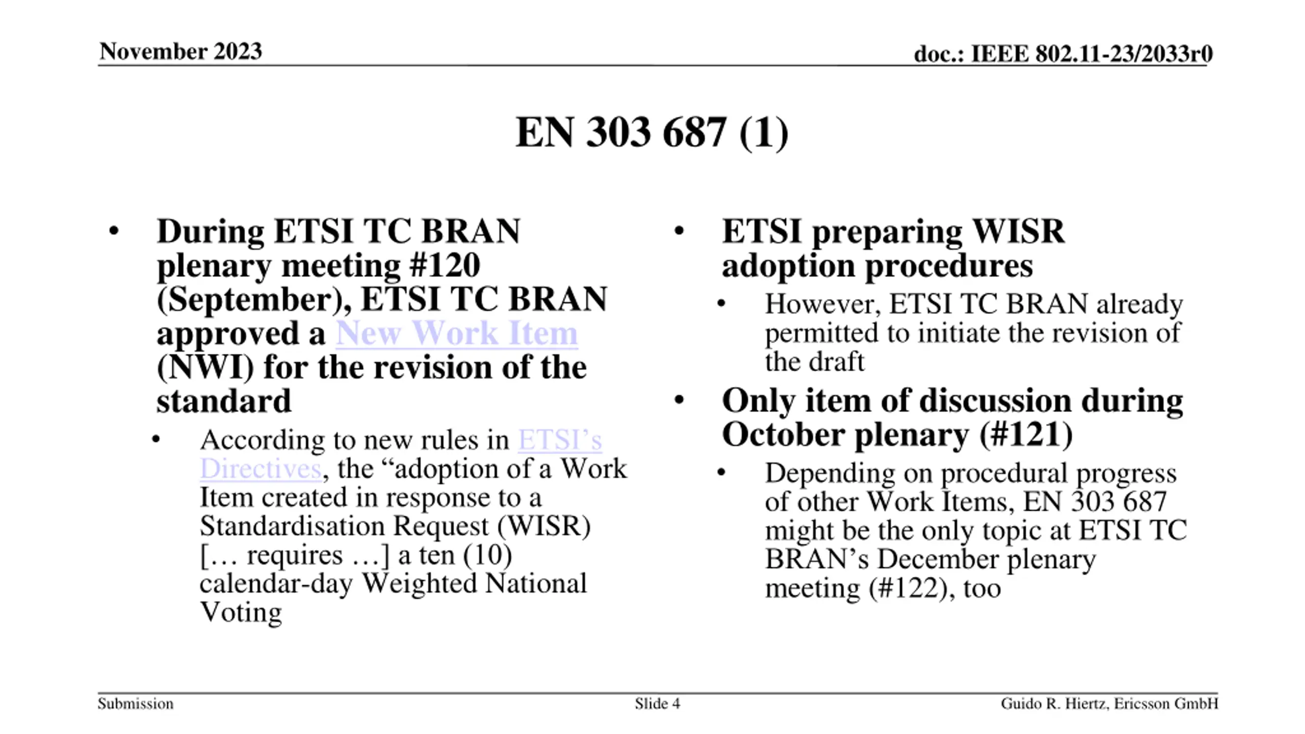 November 2023 doc.: IEEE 802.11-23/2033r0 EN 303 753 During ETSI TC BRAN plenary meeting #120 (September), ETSI TC BRAN resolved all ENAP and HASTAC comments on the draft Consequently, ETSI TC BRAN approved to submit the draft for editHelp! review followed by a 60 d ENAP recirculation Since editHelp! has not yet concluded, ETSI TC BRAN did not further work on the draft during the October plenary meeting (#121) Submission Slide 3 Guido R. Hiertz, Ericsson GmbH