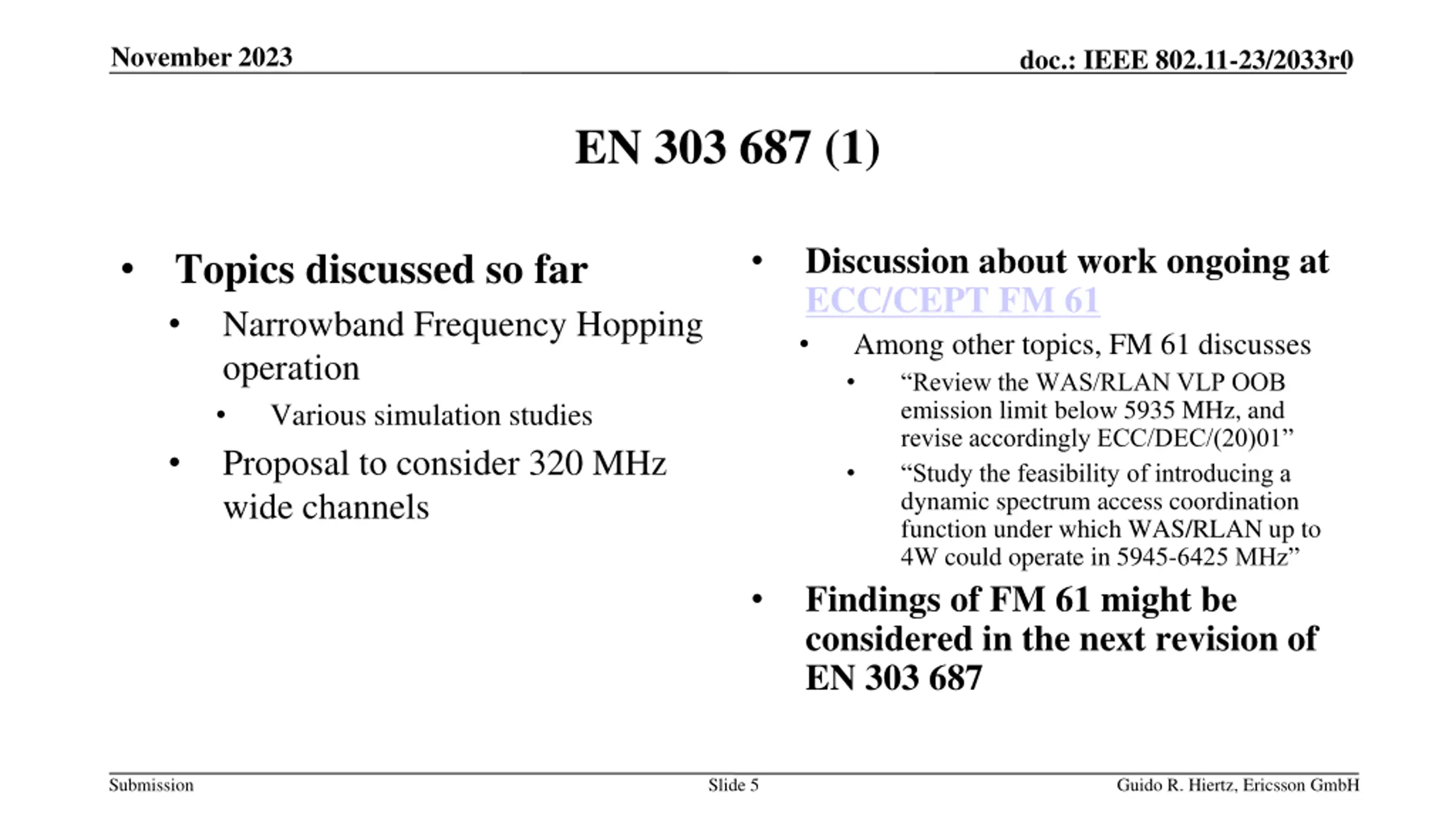 November 2023 doc.: IEEE 802.11-23/2033r0 EN 303 687 (1) During ETSI TC BRAN plenary meeting #120 (September), ETSI TC BRAN approved a New Work Item (NWI) for the revision of the standard According to new rules in ETSI s Directives, the adoption of a Work Item created in response to a Standardisation Request (WISR) [ requires ] a ten (10) calendar-day Weighted National Voting ETSI preparing WISR adoption procedures However, ETSI TC BRAN already permitted to initiate the revision of the draft Only item of discussion during October plenary (#121) Depending on procedural progress of other Work Items, EN 303 687 might be the only topic at ETSI TC BRAN s December plenary meeting (#122), too Submission Slide 4 Guido R. Hiertz, Ericsson GmbH