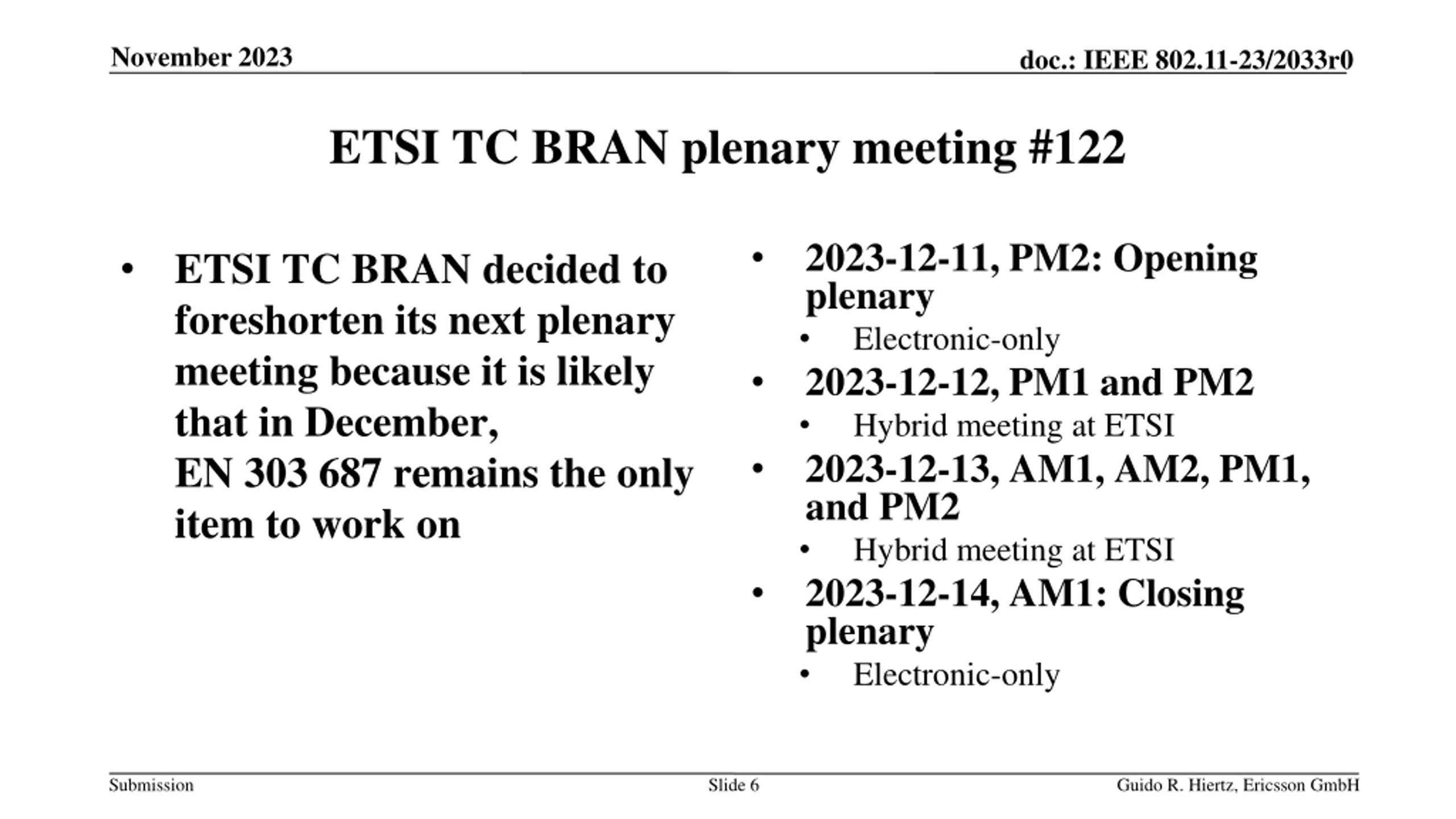 November 2023 doc.: IEEE 802.11-23/2033r0 ETSI TC BRAN plenary meeting #122 2023-12-11, PM2: Opening plenary Electronic-only 2023-12-12, PM1 and PM2 Hybrid meeting at ETSI 2023-12-13, AM1, AM2, PM1, and PM2 Hybrid meeting at ETSI 2023-12-14, AM1: Closing plenary Electronic-only ETSI TC BRAN decided to foreshorten its next plenary meeting because it is likely that in December, EN 303 687 remains the only item to work on Submission Slide 6 Guido R. Hiertz, Ericsson GmbH