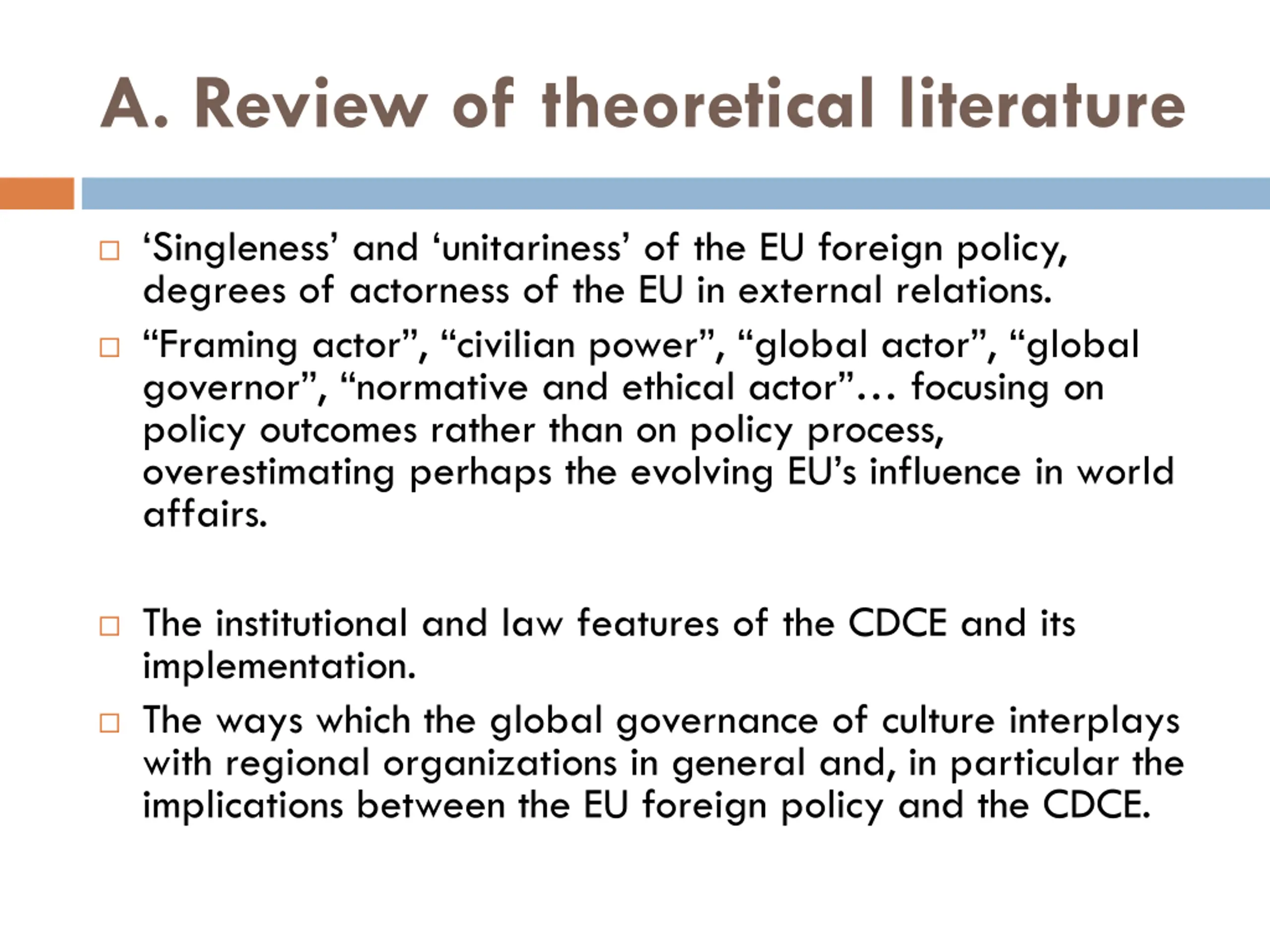 A. Review of theoretical literature Singleness and unitariness of the EU foreign policy, degrees of actorness of the EU in external relations. Framing actor , civilian power , global actor , global governor , normative and ethical actor focusing on policy outcomes rather than on policy process, overestimating perhaps the evolving EU s influence in world affairs. The institutional and law features of the CDCE and its implementation. The ways which the global governance of culture interplays with regional organizations in general and, in particular the implications between the EU foreign policy and the CDCE.