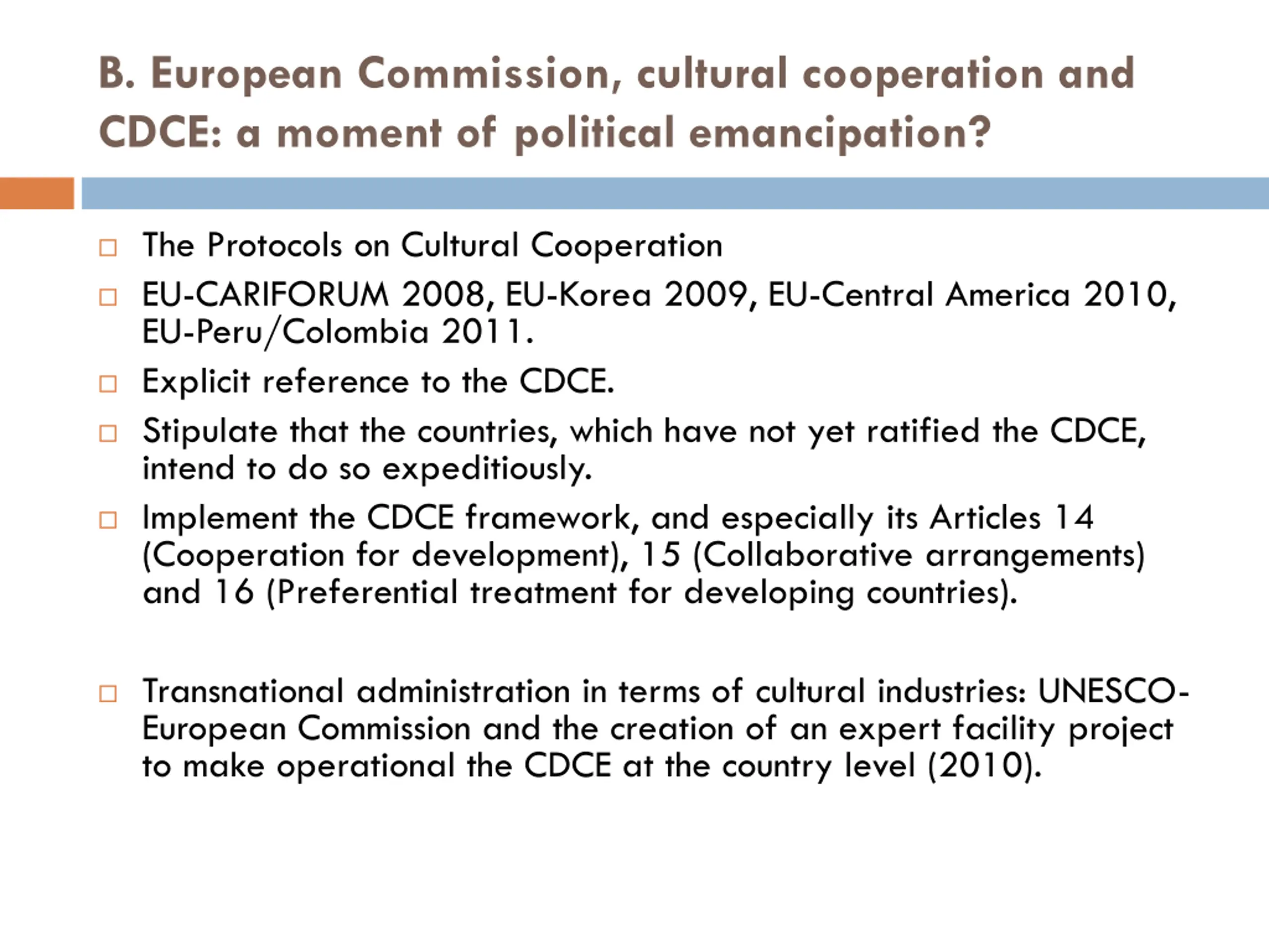 B. European Commission, cultural cooperation and CDCE: a moment of political emancipation? The Protocols on Cultural Cooperation EU-CARIFORUM 2008, EU-Korea 2009, EU-Central America 2010, EU-Peru/Colombia 2011. Explicit reference to the CDCE. Stipulate that the countries, which have not yet ratified the CDCE, intend to do so expeditiously. Implement the CDCE framework, and especially its Articles 14 (Cooperation for development), 15 (Collaborative arrangements) and 16 (Preferential treatment for developing countries). Transnational administration in terms of cultural industries: UNESCO- European Commission and the creation of an expert facility project to make operational the CDCE at the country level (2010).