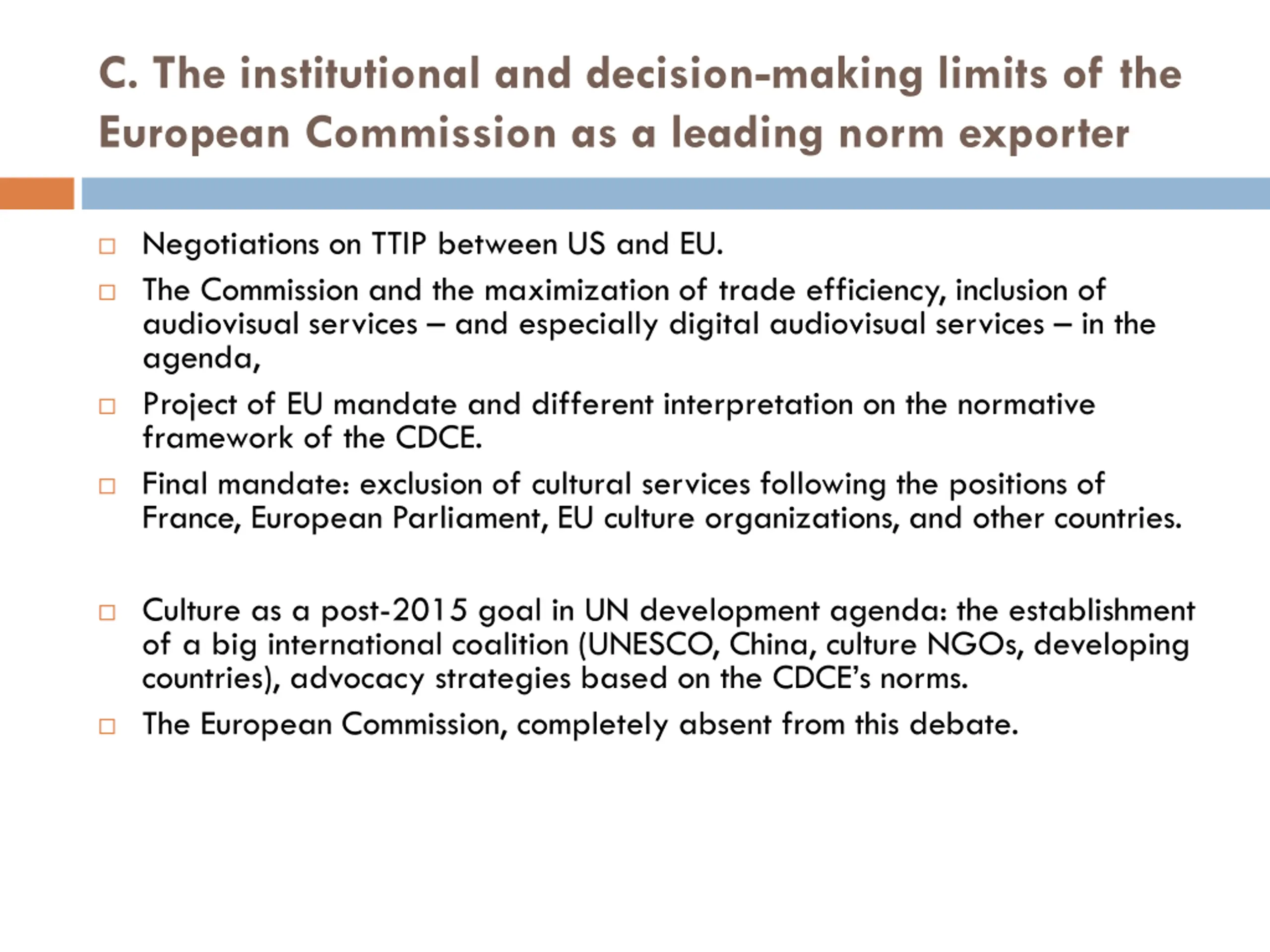 C. The institutional and decision-making limits of the European Commission as a leading norm exporter Negotiations on TTIP between US and EU. The Commission and the maximization of trade efficiency, inclusion of audiovisual services and especially digital audiovisual services in the agenda, Project of EU mandate and different interpretation on the normative framework of the CDCE. Final mandate: exclusion of cultural services following the positions of France, European Parliament, EU culture organizations, and other countries. Culture as a post-2015 goal in UN development agenda: the establishment of a big international coalition (UNESCO, China, culture NGOs, developing countries), advocacy strategies based on the CDCE s norms. The European Commission, completely absent from this debate.