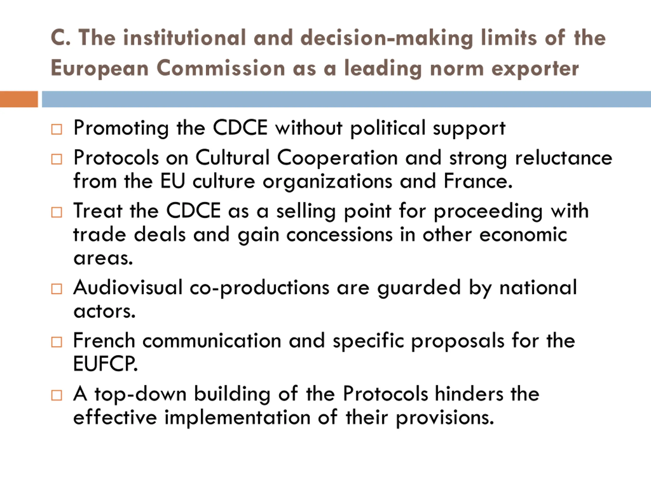 C. The institutional and decision-making limits of the European Commission as a leading norm exporter Promoting the CDCE without political support Protocols on Cultural Cooperation and strong reluctance from the EU culture organizations and France. Treat the CDCE as a selling point for proceeding with trade deals and gain concessions in other economic areas. Audiovisual co-productions are guarded by national actors. French communication and specific proposals for the EUFCP. A top-down building of the Protocols hinders the effective implementation of their provisions.