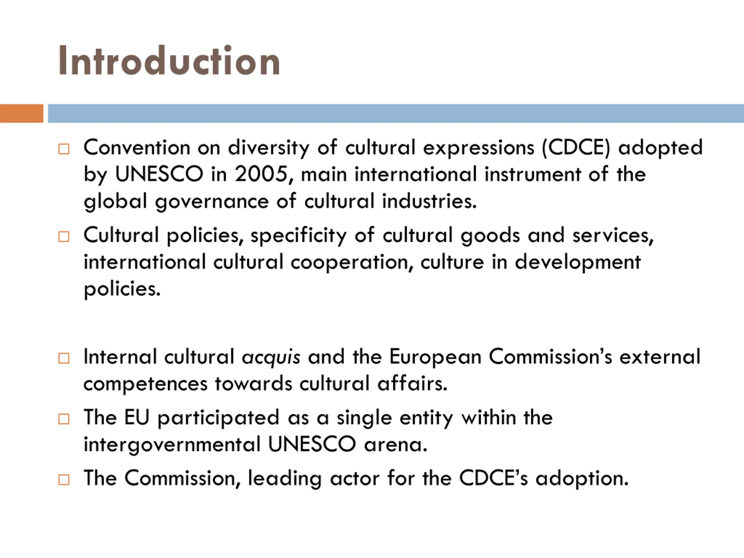 Introduction Convention on diversity of cultural expressions (CDCE) adopted by UNESCO in 2005, main international instrument of the global governance of cultural industries. Cultural policies, specificity of cultural goods and services, international cultural cooperation, culture in development policies. Internal cultural acquis and the European Commission s external competences towards cultural affairs. The EU participated as a single entity within the intergovernmental UNESCO arena. The Commission, leading actor for the CDCE s adoption.